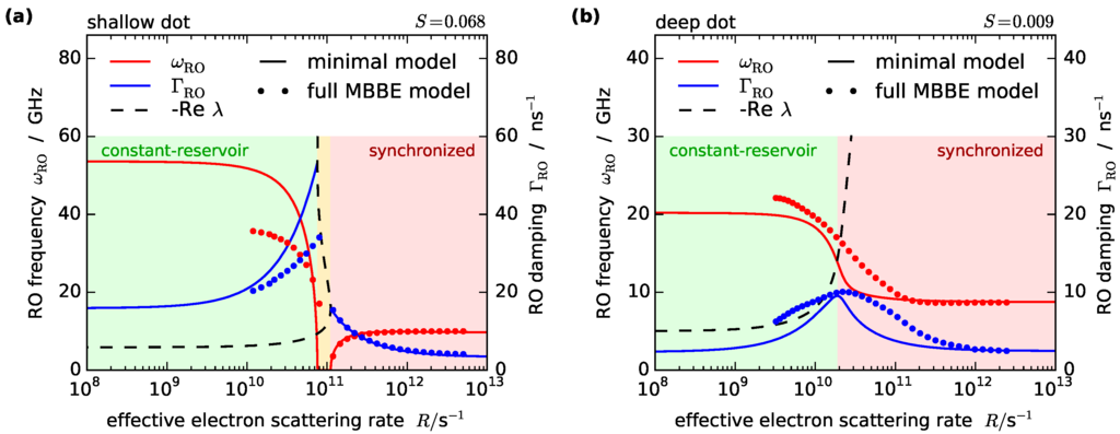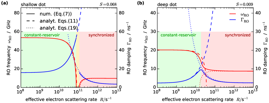In terms of the scattering-rate dependence of the eigenvalues, the two QD structures reveal qualitative different behaviors, as shown in Figure 1. The shallow dot shows pronounced ROs () for slow scattering (constant-reservoir regime), which become increasingly dampened until they disappear in the overdamped regime around s . For even higher scattering (synchronized regime), pronounced slower ROs reappear. The deep-dot structure, on the other hand, reveals a smooth transition between the fast oscillations in the constant-reservoir regime to the slower oscillations in the synchronized regime, with a less pronounced peak in the damping in between.