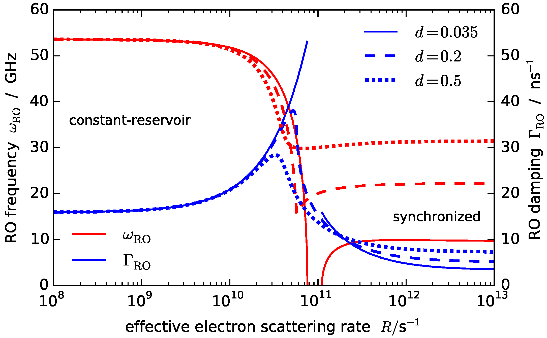 Equation (7) allows us to investigate the underlying cause of the qualitative differences between the scattering-rate dependencies of the two QD structures. The most prominent difference between the two cases is the value of the detailed-balance coefficient d. Its effect is shown in Figure 2, where for the shallow dot we have varied the value of d and evaluated the RO parameters in dependence of R (again keeping the photon number S constant). For increasing d, we observe a transition between the well-separated three dynamic regimes to the smooth transition between the constant-reservoir and synchronized regime, along with a substantial increase of the RO frequency in the synchronized regime. This behavior shows that the detailed balance of the in and out-scattering rates plays a crucial role in determining the dynamics for moderate to high scattering rates. This is an important result as most models usually neglect this dependence and use constant in and out-scattering rates [26,27,28]. Those models cannot describe the third regime of quantum-dot laser dynamics. Assuming a linear increase of the scattering rates and neglecting the detailed balance, as done in [8,9], leads to similar limits, however mixing the effects of scattering rate R (Coulomb interaction) and carrier distribution coupling d (energy band structure) in one parameter. Note that increasing R and simultaneously decreasing d corresponds to the limit of increasing B in [9]. Our microscopic calculations of the scattering rates show that most QD lasers will operate within the synchronized regime where the effect of the coupling between QD and reservoir occupation becomes important. A correct description of the detailed balance via a dependence of the quasi-equilibrium QD occupation on the reservoir density is therefore required to accurately predict the QD laser behavior.