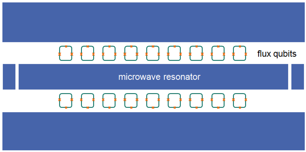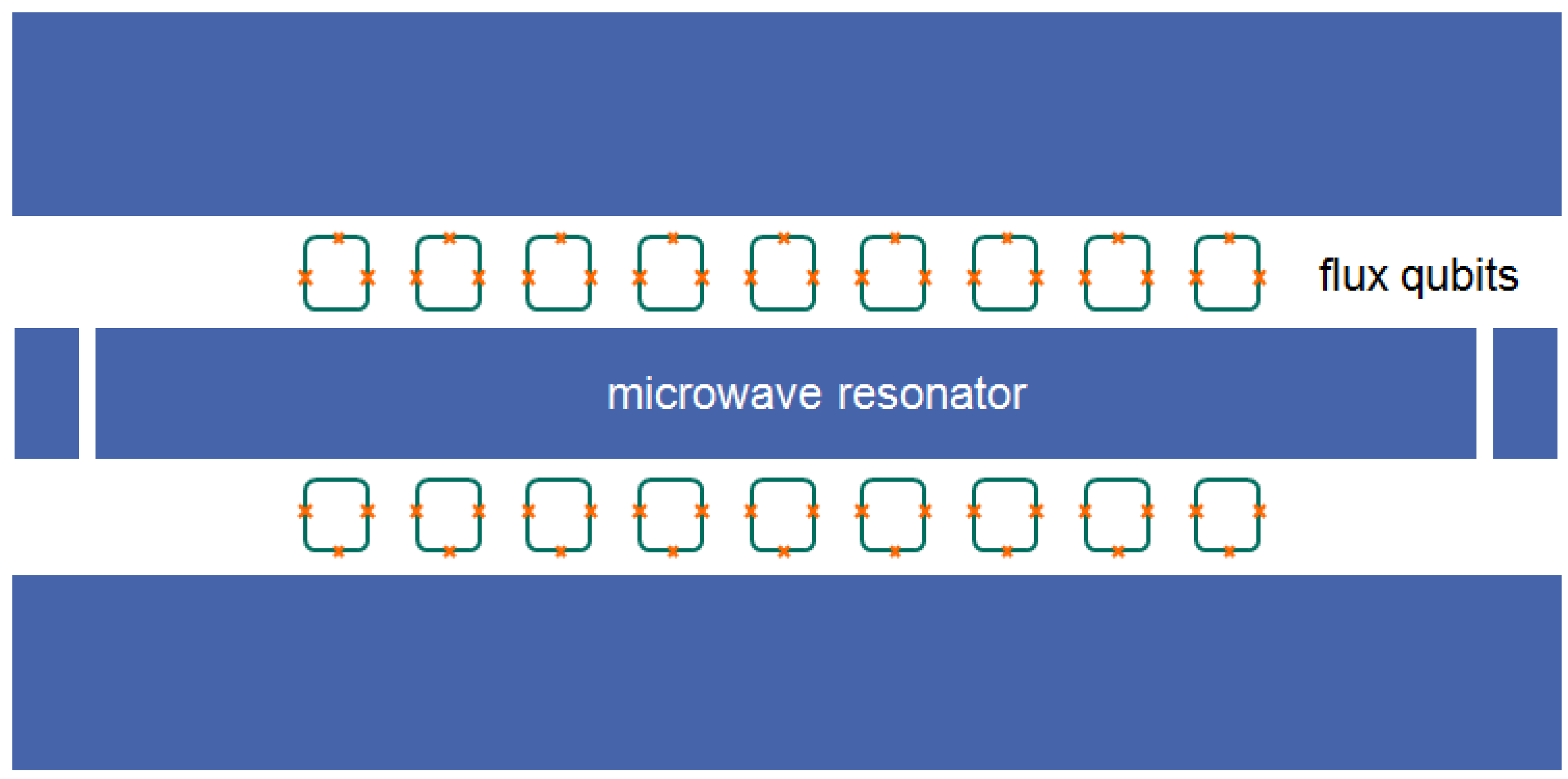 Sketch of quantum metamaterial formed by an array of flux qubits embedded into a microwave resonator.