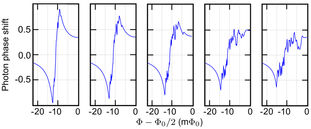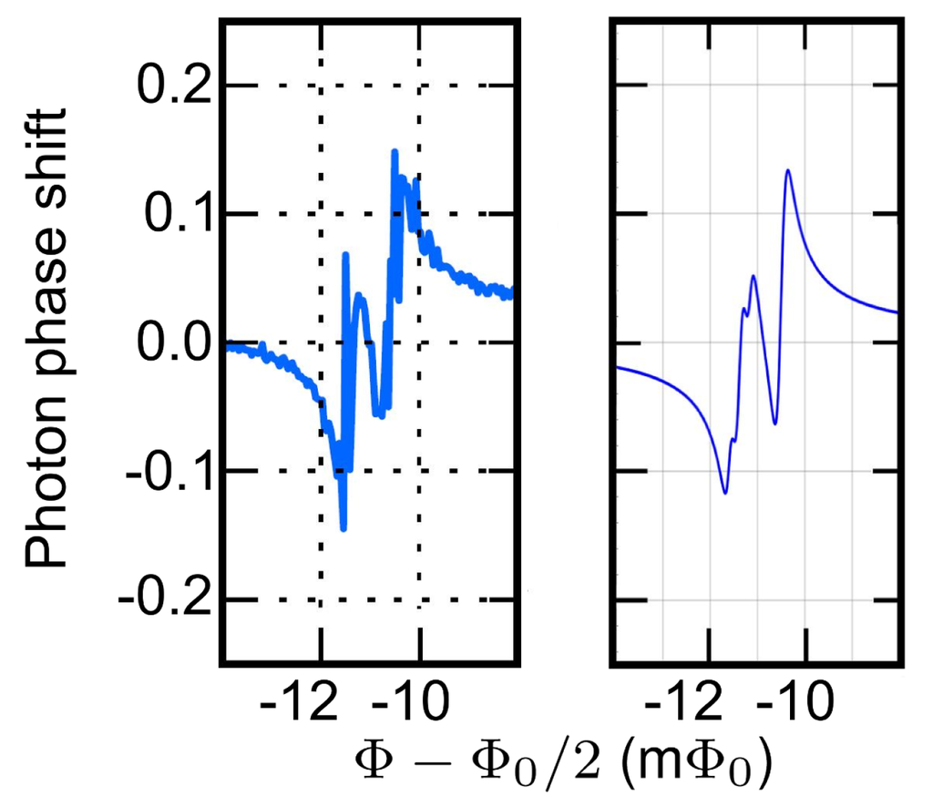 Experimental (left panel) and numerical (right panel) results for the photon phase shift as a function of external flux bias Φ, calculated for the system of qubits.
