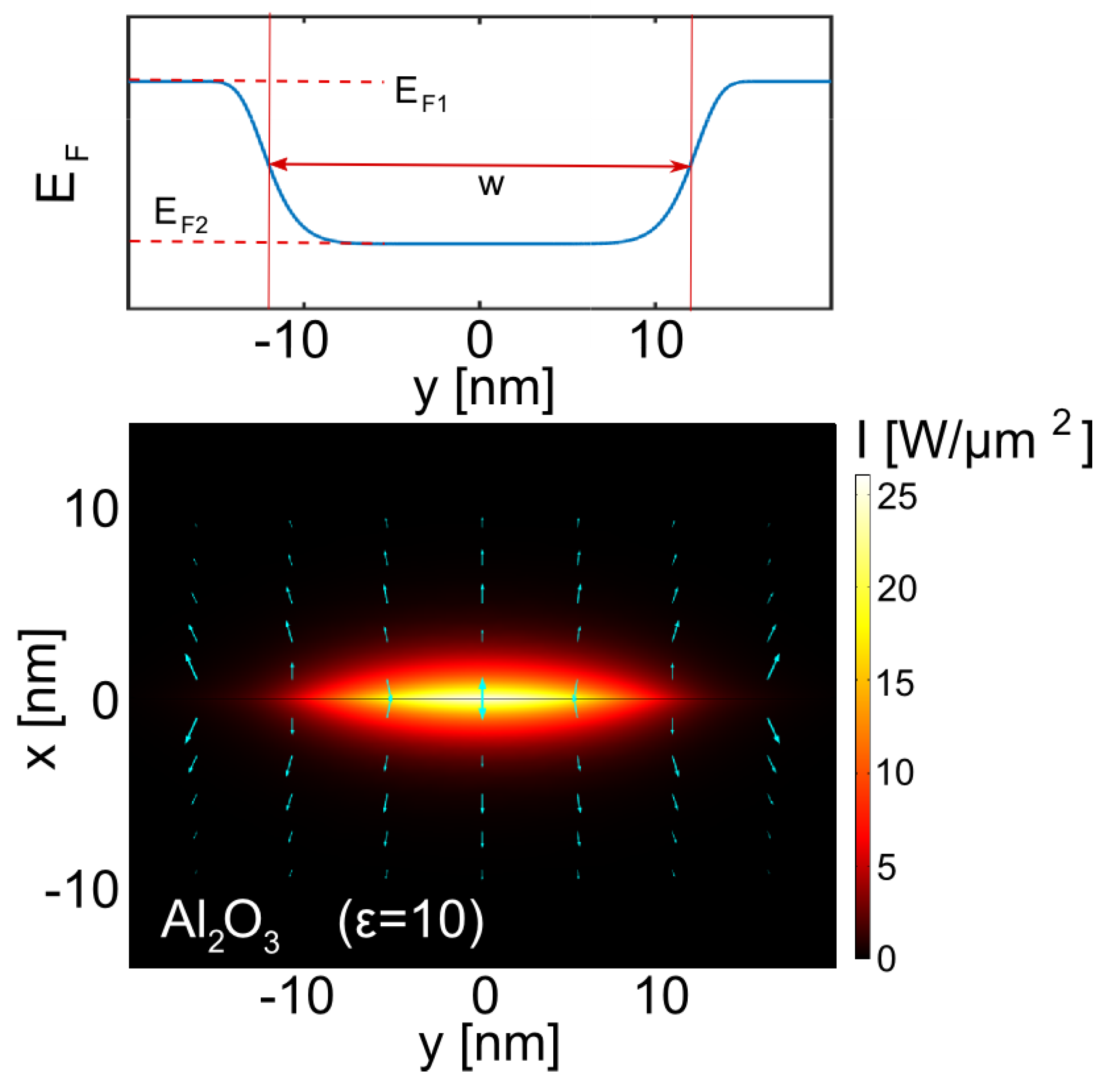 Graphene surface plasmon (GSP) waveguide formed by a modulation of the graphene Fermi energy (see top panel), graphene is embedded into a dielectric () with the relative permittivity . The bottom panel illustrates field intensity distribution in the fundamental guided mode at m for the case of eV, eV and nm, the total power of the mode is mW. Cyan arrows indicate the in-plane direction and magnitude of electric field.