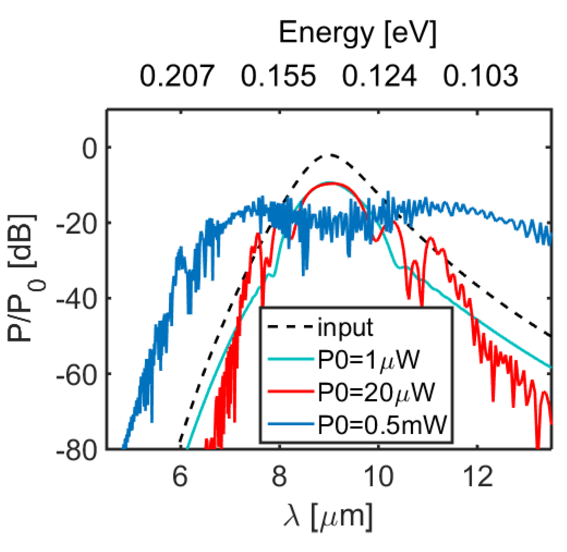 To illustrate the nonlinear functionality of GSP waveguides, here we consider the spectral broadening process of a short pulse propagating in a 25 nm wide waveguide. We set the initial pulse to be fs long (FWHM, sech pulse), centered at = 9 μm and with a variable peak power . The nonlinear coefficient at this wavelength is ×W, and the critical power is mW, cf. also bottom panel if Figure 1. The attenuation constant is , which gives the attenuation length nm. The waveguide length was set to nm. The dispersion at = 9 μm is computed as 9.2 × 10s. For the chosen pulse duration, this gives the dispersion length 1.1 μm [35]. Hence the dispersive spreading of the pulse is practically negligible over the full waveguide length, which helps to sustain high efficiency of the nonlinear spectral broadening. In Figure 3 output spectra for different input peak powers are plotted. For the peak power as low as 0.5 mW a considerable spectral broadening can be observed. The generated mid-infrared supercontinuum covers more than one optical octave and spans from λ = 6 μm to λ > 13 μm. While this peak power is well below the estimated critical power , a similar spectral broadening could be observed in samples with shorter attenuation lengths, e.g., due to reduced relaxation times τ in graphene, by increasing further.