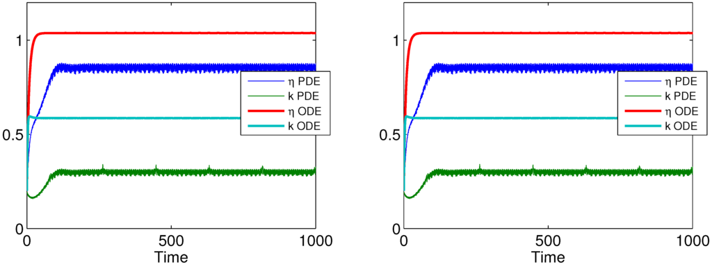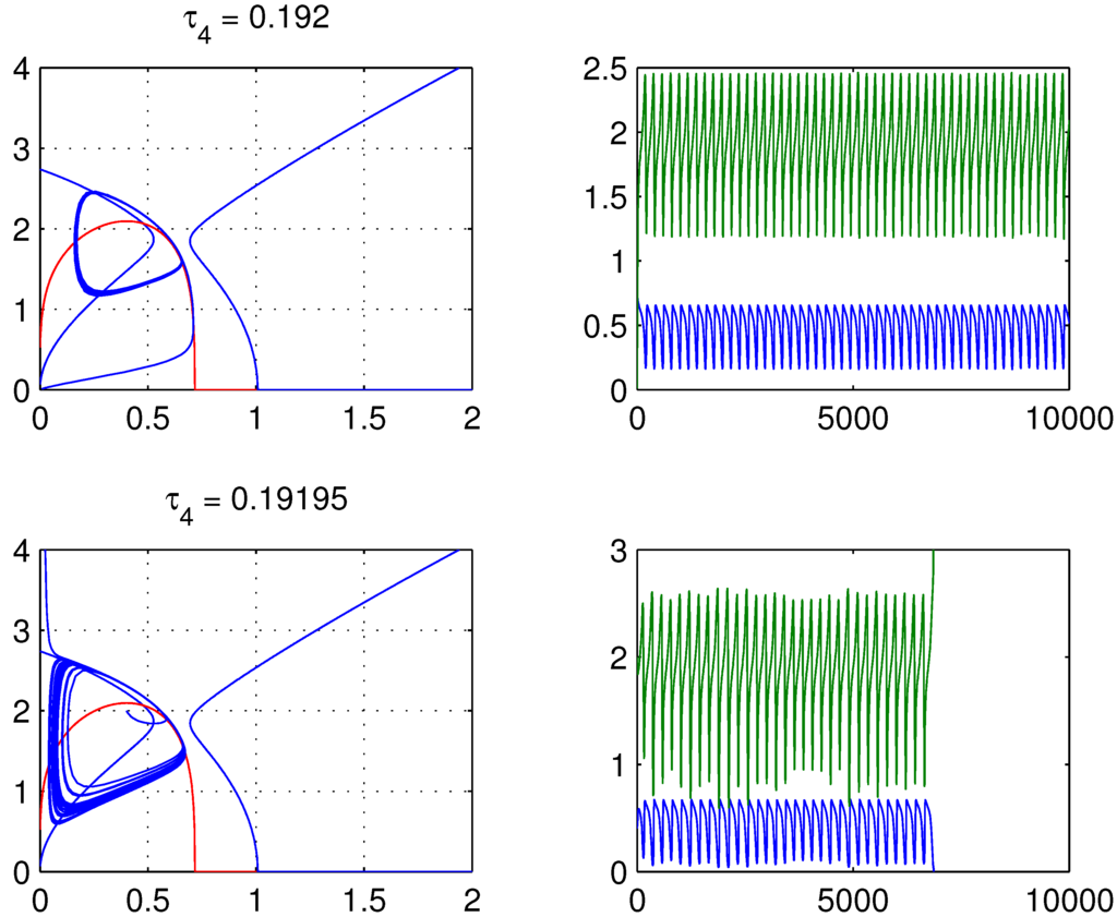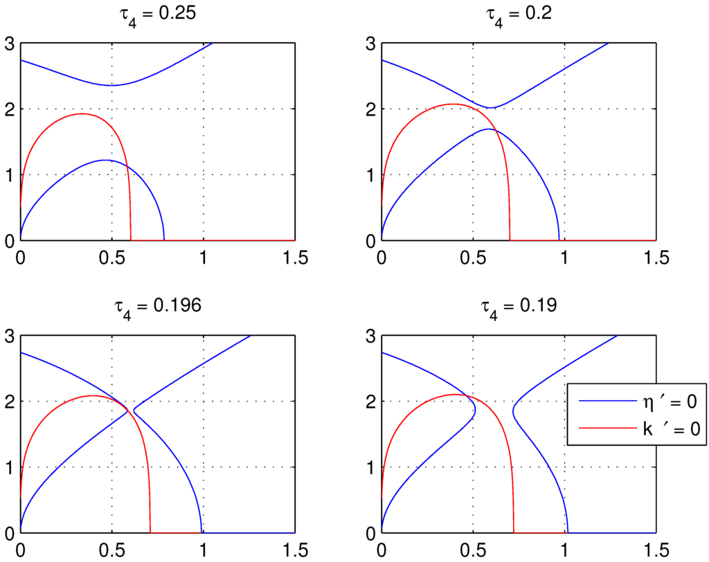 In this bifurcation, a limit cycle is created around the unstable spiral as indicated by Figure 7. This limit cycle increases with decreasing In the top panels, , and trajectories are repelled from the fixed point and the unstable spiral in what appears to be a stable limit cycle. The top right panel indicates that these high amplitude oscillations persist indefinitely. As decreases further, a third bifurcation occurs, in which the limit cycle expands and collides with the stable manifold of the saddle on the k-axis and is destroyed. However, for values of near this bifurcation, solutions also enter a quasi-periodic orbit for a finite time, but eventually are repelled and attracted along the stable manifold of the saddle point on the η-axis, as shown in the lower panels of Figure 7.