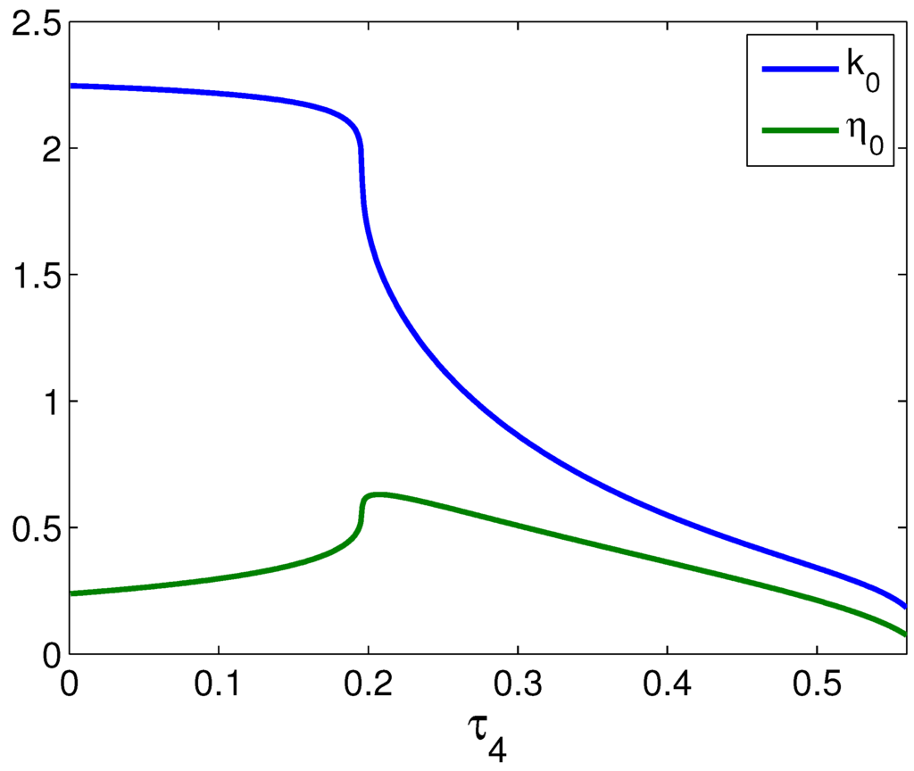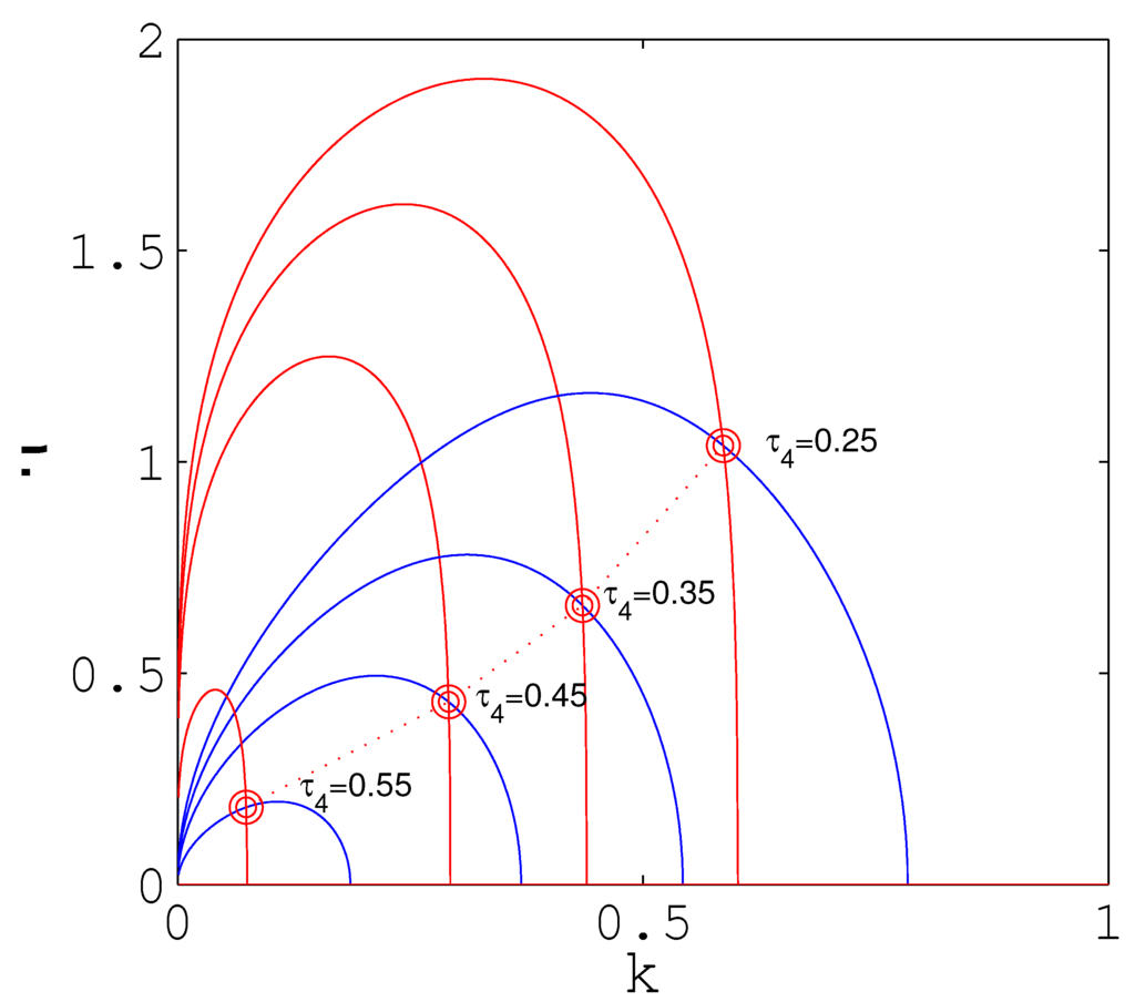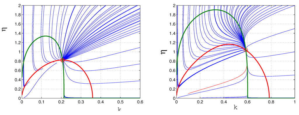 Of greater interest is the behavior of fixed points in the first quadrant, which correspond to pulses of finite width and amplitude. For all values of , the location of the only non-trivial fixed point is at the intersection of the k nullcline with the lower branch of the η nullcline, as shown in the top two panels of Figure 5. Qualitatively, these fixed points all have the same stability. As decreases, the two branches of the η nullcline approach one another and meet when For , both the upper and lower branches of η nullcline have gaps for some small interval of k, as shown in the lower two panels. That is, within that k interval, η is always increasing. When this split occurs, the fixed point is to the left of this split and initially remains on the lower branch. As decreases further, this gap widens, and eventually, the fixed point moves onto the upper branch of the η nullcline, as shown in the lower right panel.