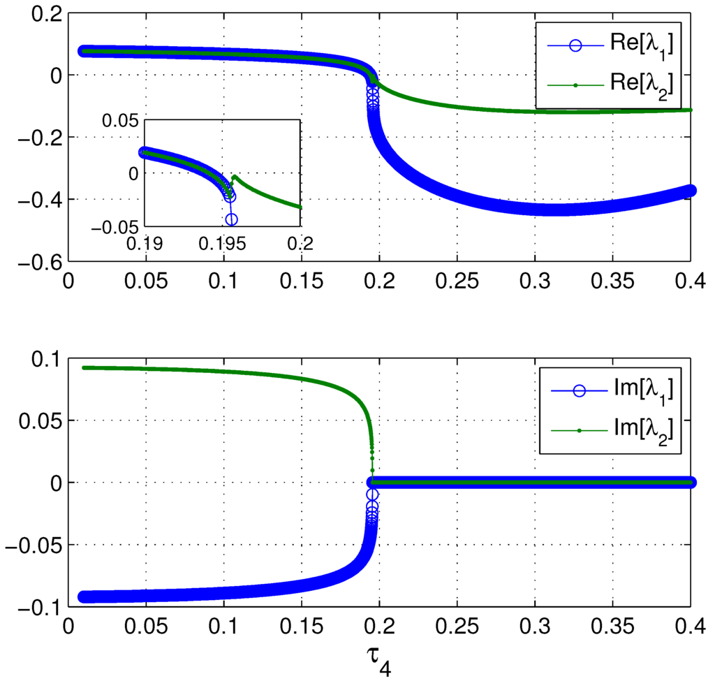 By evaluating Equation (16), we can readily determine the stability of each fixed point. The real and imaginary parts of the eigenvalues are shown in Figure 6. We see that for , the eigenvalues are real and negative, indicating that the fixed point is a stable node, corresponding to the phase planes in the upper panels of Figure 5. In this parameter regime, mode locking is feasible. Even as the fixed point moves to the left of the gap, as in the bottom left panel of Figure 5, its stability initially remains unchanged. For a narrow region of parameter space, for , the eigenvalues of Equation (16) become complex conjugate, with a negative real part. Thus, the fixed point becomes a stable spiral and still attracts nearby trajectories. When , the system undergoes a supercritical Hopf bifurcation, and the fixed point becomes an unstable spiral.