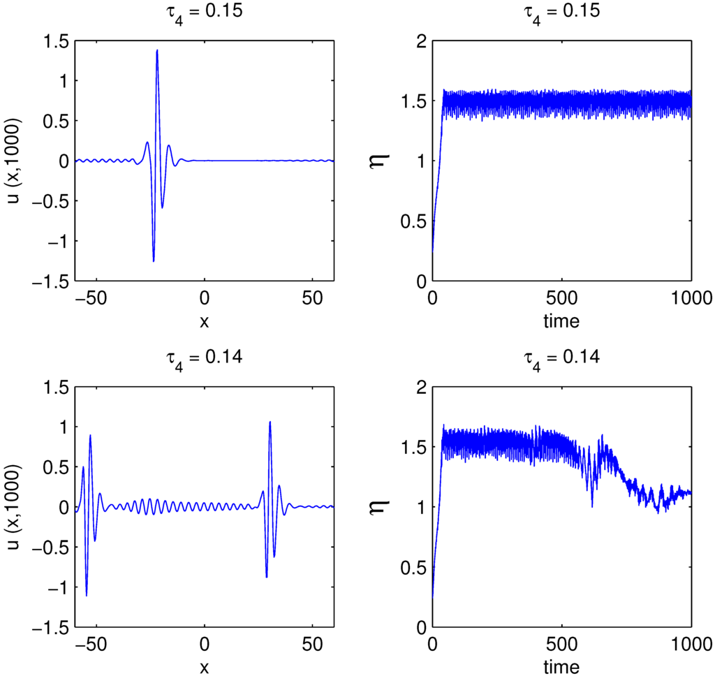 For those parameter values when is sufficiently small, the ODE model predicts that solutions spiral away and eventually grow exponentially tall along the η-axis. For long times, the PDE does not exhibit this behavior. Rather, solutions receive sufficient gain that their amplitude grows, and they undergo an instability, leading to pulse splitting, the onset of which exhibits amplitude oscillations, characteristic of the unstable spiral. Since the ansatz for this paper does not permit multi-pulse solutions, we cannot expect the comparison to hold in this region. However, the ODE model does accurately predict the instability of pulsed solutions for sufficiently small and accurately predicts that this instability is oscillatory, as is typically the case with pulse pulsing. Figure 8 shows two solutions to the PDE, one for and another at As is reduced, the single-pulse solution becomes unstable and splits into two. Note that the bottom right panel shows that the amplitude remains about constant for long times, until around , after which the amplitude goes through oscillations before stabilizing to the two-pulse solution. This is in complete accordance with the prediction of the ODE model, as predicted by the Hopf bifurcation and illustrated in Figure 7.