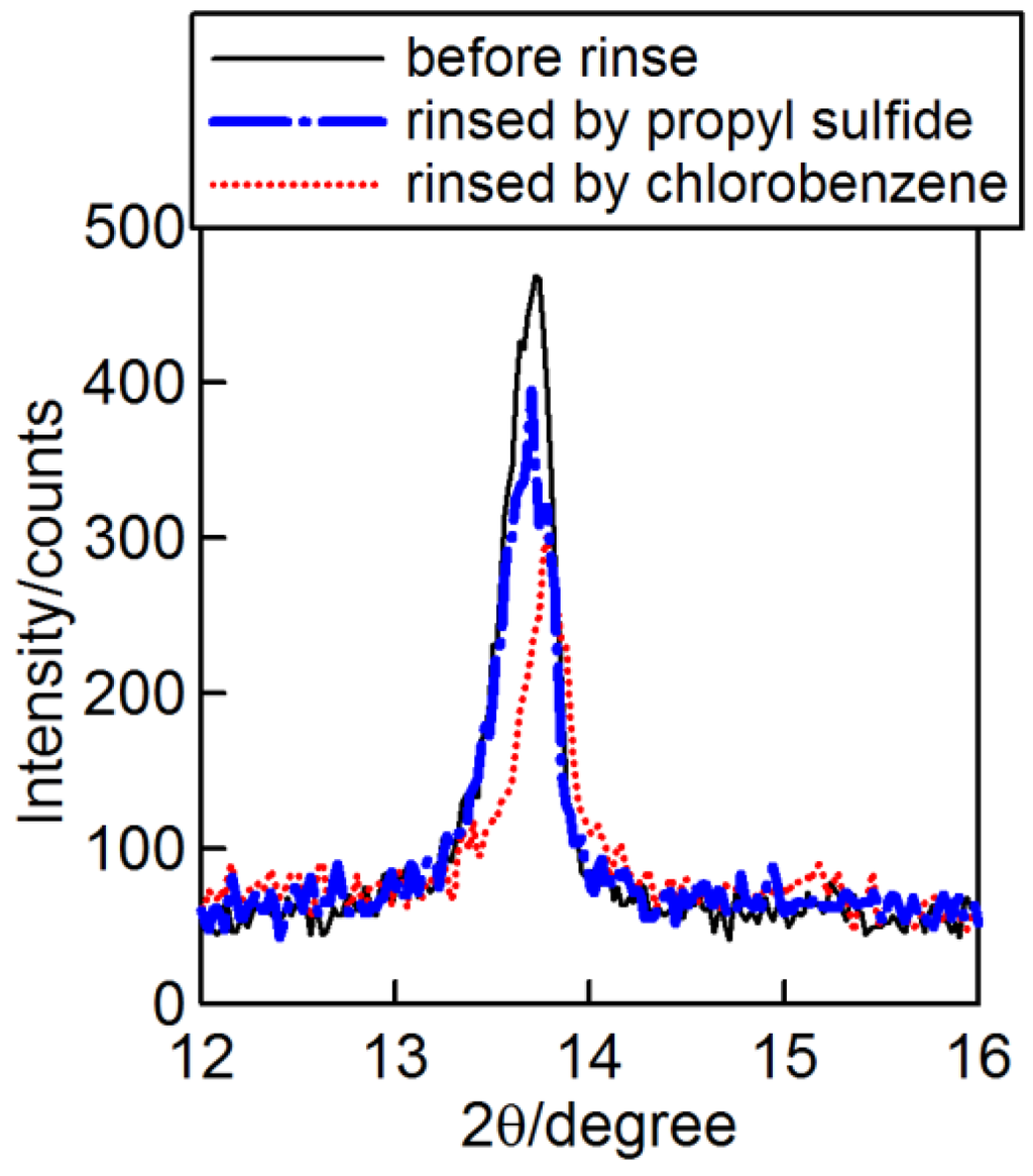 At first, the solvent-rinsing effect on CH3NH3PbI3 perovskite crystal variation was considered before the HTM deposition itself. Figure 1 shows the XRD patterns of the CH3NH3PbI3 perovskite crystal after spin-coating chlorobenzene (solvent of spiro-OMeTAD) and propyl sulfide (solvent of CuSCN) on one-step processed CH3NH3PbI3 perovskite layers. The original CH3NH3PbI3 perovskite crystal showed the XRD peak at 13.7° and 468 counts. Although the intensity of XRD counts was related to the measurement setup, the height between the samples can be compared to discuss the variation of crystal structures using the same system consistently. It was surprising that just spin-coating chlorobenzene, which has been used for the spiro-OMeTAD deposition as an inert solvent against the CH3NH3PbI3 perovskite crystal, can shift the peak to a higher angle and reduce the height of the XRD peak to half of the original one. The XRD peak shift to a higher angle means that the crystal lattice became shorter. This phenomenon may be due to the extraction of remaining DMF in the perovskite layer to chlorobenzene, which was explained as the “antisolvent method” published by Xiao et al. [14]. This result informs us that the remaining DMF in the perovskite crystal after the annealing procedure can be removed, because of the softness of the CH3NH3PbI3 perovskite crystal [6,7]. In contrast, propyl sulfide (the solvent of CuSCN) did not change the XRD peak of the CH3NH3PbI3 perovskite crystal, but reduced the XRD peak height. Since solvents (chlorobenzene and propyl sulfide) reduce the XRD peak of the CH3NH3PbI3 perovskite crystal, the deposition of HTM by spin-coating can reduce the crystallinity of CH3NH3PbI3 perovskite due to the solvent effect.