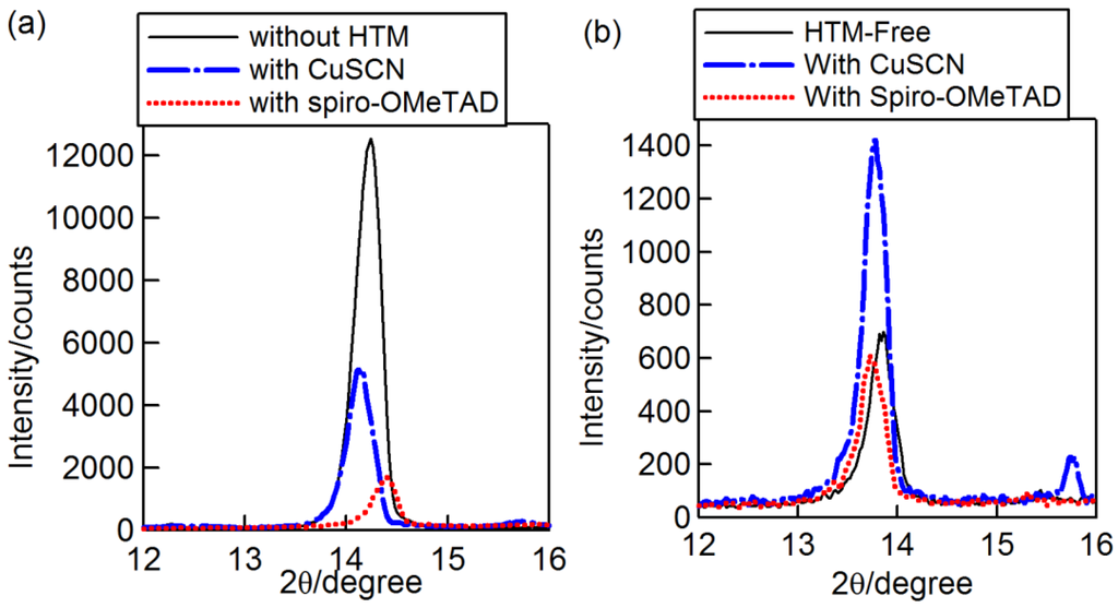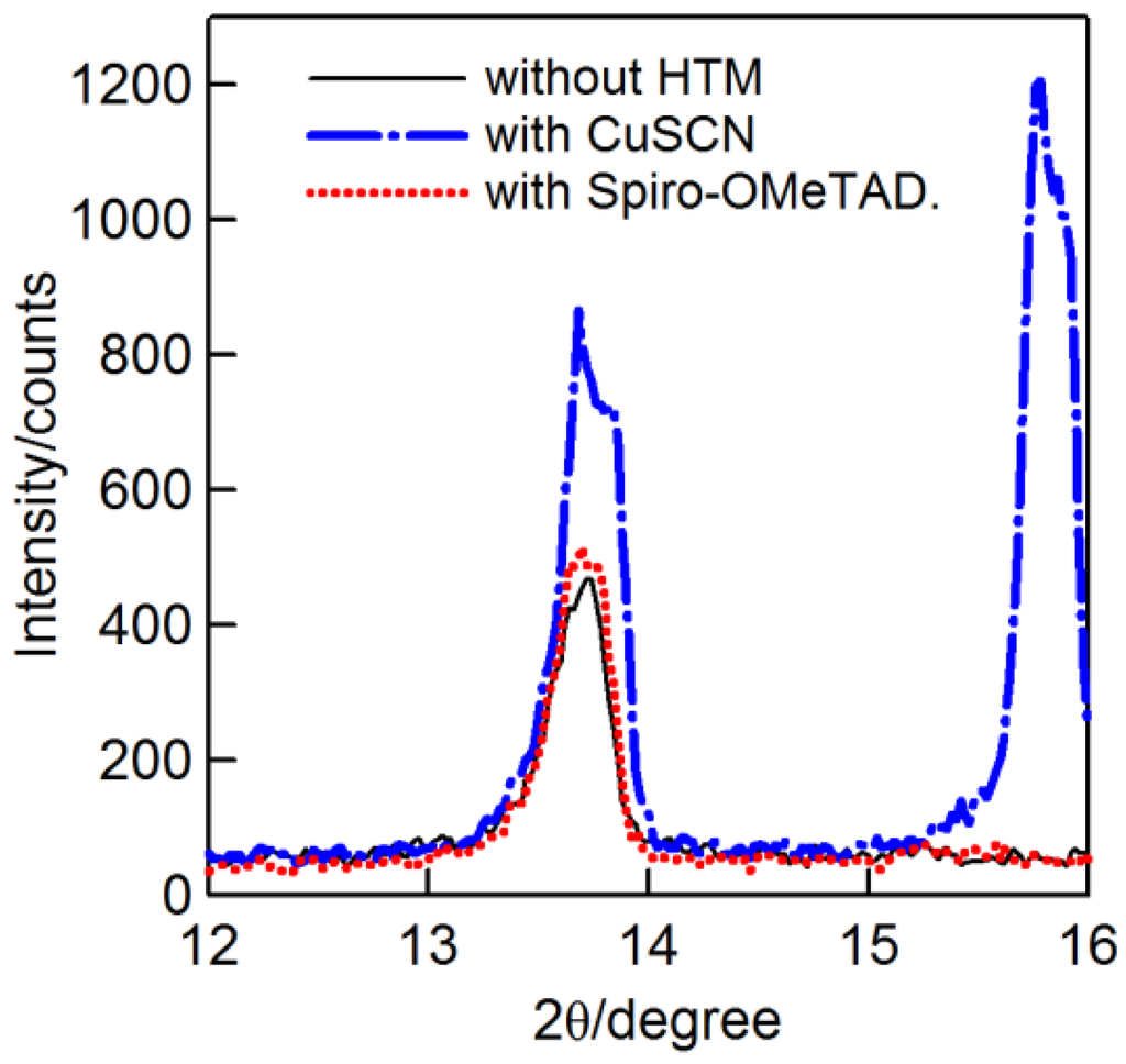 Figure 2 shows the XRD patterns of one-step-processed CH3NH3PbI3 perovskite crystals with HTM layers. The peak at 15.8° represents the crystal of the CuSCN layer. It was surprising that CuSCN deposition enhanced the crystallinity of CH3NH3PbI3 perovskite, which may be due to the Cu+-ion and SCN−-ion migration into CH3NH3PbI3 perovskite, resulting in the enhancement of the perovskite crystal. Actually, CH3NH3Pb(SCN)2I can also be a perovskite solar cell, effectively [15]. In contrast, the XRD pattern of CH3NH3PbI3 perovskite did not change with spiro-OMeTAD deposition. Hence, it was considered that the solvent of spiro-OMeTAD (chlorobenzene) can shift the XRD peak position to the higher angle, but that the dopant (which may be lithium ion and TBP) can shift it back to the original position, due to the special phenomena of material migration in the CH3NH3PbI3 perovskite crystal [6,7].