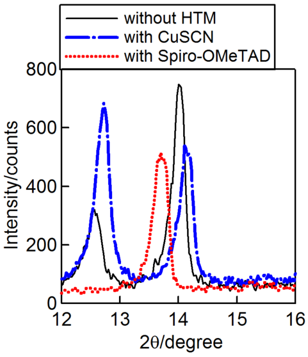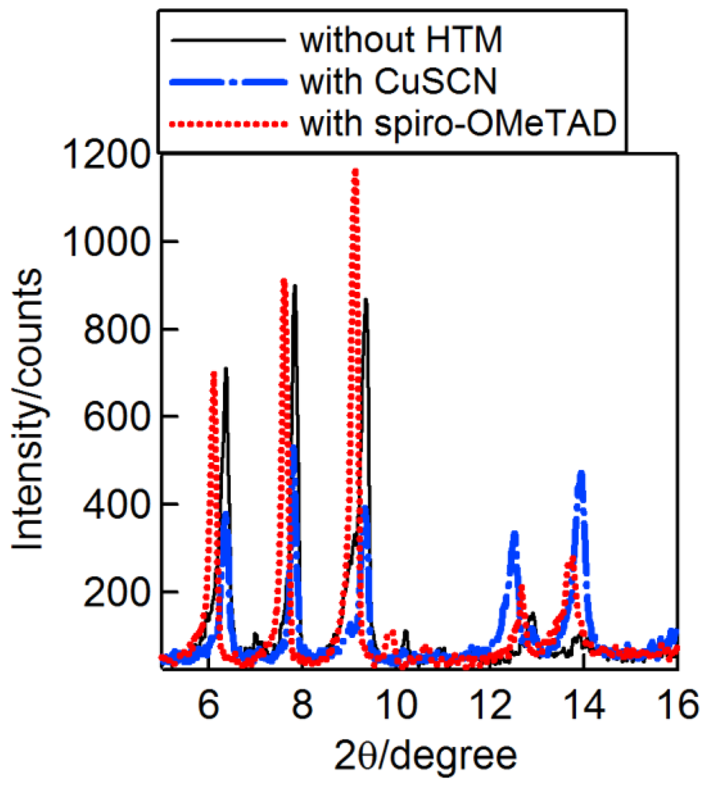 Figure 5 shows the XRD patterns of the 5-AVA-doped CH3NH3PbI3 perovskite crystal by spin-coating deposition. Although only one XRD peak of 5-AVA-doped CH3NH3PbI3 perovskite was observed below 10° in the literature [12], three intense peaks from 6° to 10° were observed as the 2D CH3NH3PbI3 perovskite crystal. The difference from the published results may be due to the fabrication methods: spin-coating and drop casting. Without HTM, the peaks of the three-dimensional (3D) CH3NH3PbI3 perovskite crystal (at 13.9°) and PbI2 (at 12.9°) were quite small. Adding CuSCN HTM, the peak position of the 2D CH3NH3PbI3 perovskite crystal did not change, but the peak height was decreased to less than half. At the same time, the peaks of the 3D CH3NH3PbI3 perovskite crystal (at 13.9°) and PbI2 (at 12.5°) were increased significantly. The peak height of the 3D CH3NH3PbI3 perovskite crystal became very close to the one-step-processed CH3NH3PbI3 perovskite. Adding spiro-OMeTAD, in contrast, the peak position of the 2D CH3NH3PbI3 perovskite crystal was shifted to the lower angle, and the peak height was increased. Although the peaks of the 3D CH3NH3PbI3 perovskite crystal and PbI2 were increased, the increment by spiro-OMeTAD was half of that by CuSCN. Hence, spiro-OMeTAD did not change the 2D CH3NH3PbI3 perovskite crystal, but some of the contents (maybe the lithium ion and TBP) can be inserted between the 2D CH3NH3PbI3 perovskite layers, which can be explained by the peak shift of 2D perovskite to the lower angle. Such a 2D perovskite layer has stability against moisture [12,16]. However, it was confirmed that such a 2D perovskite also can be changed by HTM deposition.