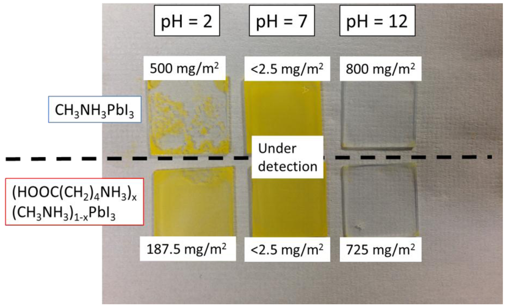 However, it was found that the resulting PbI2 layer from the 2D CH3NH3PbI3 perovskite layer has higher stability than the 3D perovskite crystal. Figure 6 shows a picture of PbI2 layers after water deposition (with different pH) of CH3NH3PbI3 perovskite layers (with/without 5-AVA doping). The CH3NH3PbI3 perovskite layers with/without 5-AVA doping have been decomposed to PbI2 by dipping in water. When the amount of eluted Pb in the water was measured, no elution of Pb was observed using neutral water (pH = 7). However, alkaline water solution (pH = 12 of NaOH aq. solution) dissolved the CH3NH3PbI3 perovskite layers completely. The observed amounts of Pb ion using CH3NH3PbI3 perovskite layers with/without 5-AVA doping were 800 mg/m2 and 725 mg/m2, respectively. This small variation may be due to the difference of thickness after the 5-AVA doping. The significant difference of doping was confirmed using acidic water solution (pH = 2, HCl aq. solution). The 5-AVA doping can enhance the stability of the PbI2 crystal against acidic water solution. This kind of effort to suppress the leakage of Pb elution should be improved for the application of organo lead halide perovskite solar cells.