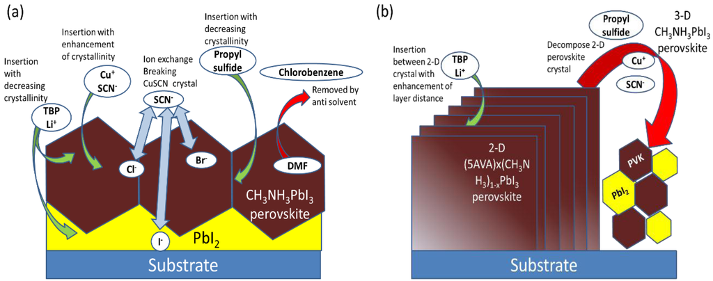 Figure 7 shows a summary of the reaction image between the CH3NH3PbI3 perovskite crystal for the deposition of solvents (chlorobenzene and propyl sulfide) and HTM (spiro-OMeTAD and CuSCN). Chlorobenzene can extract DMF in the non-dried perovskite layer [14]. Moreover, the chlorobenzene may have a similar effect on the annealed perovskite layer (from Figure 1). In contrast, propyl sulfide did not shift the peak position, but decreased the intensity due to the decomposing of the smaller crystal (from Figure 1). The thiocyanate ion (SCN−) can be exchanged by the iodide ion (I−) in PbI2 [15] and by the chloride (Cl−) and bromide (Br−) ions doped in perovskite crystals to be CH3NH3Pb(SCN)2I perovskite [15], resulting in the prevention of the CuSCN crystal on the CH3NH3PbI3 perovskite layer (from Figure 2, Figure 3 and Figure 4). The Cu+ ion and the SCN− ion can enhance the crystallinity of CH3NH3PbI3 perovskite. However, the chloride ion and the excess amount of I− (from PbI2) can suppress the enhancement of the CH3NH3PbI3 perovskite crystallinity. For the 2D (5-AVA)x(CH3NH3)1-xPbI3 perovskite crystal, the lithium ion and TBP in spiro-OMeTAD HTM can be inserted between the layered perovskite crystal (as in Figure 7b, from Figure 5). The deposition of CuSCN HTM can convert the 2D crystal to a 3D one.
