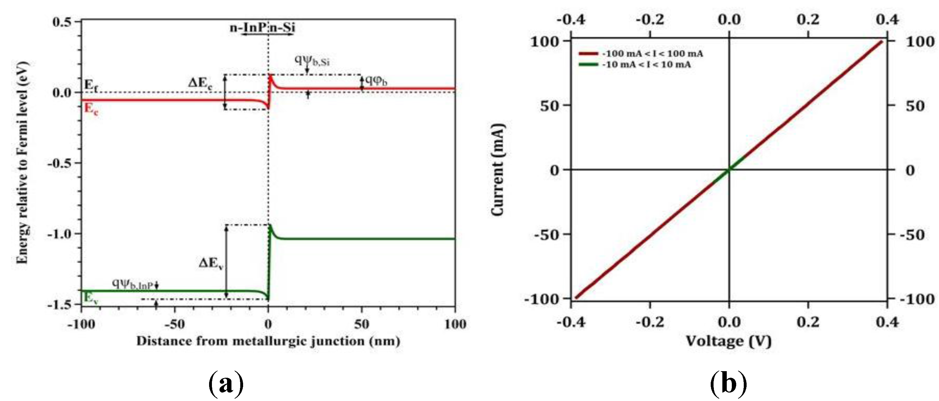 (a) Computed band diagram of the n-InP/n-Si heterojunction, (b) 4-points measurement of the I(V) characteristic of the hybrid interface.
