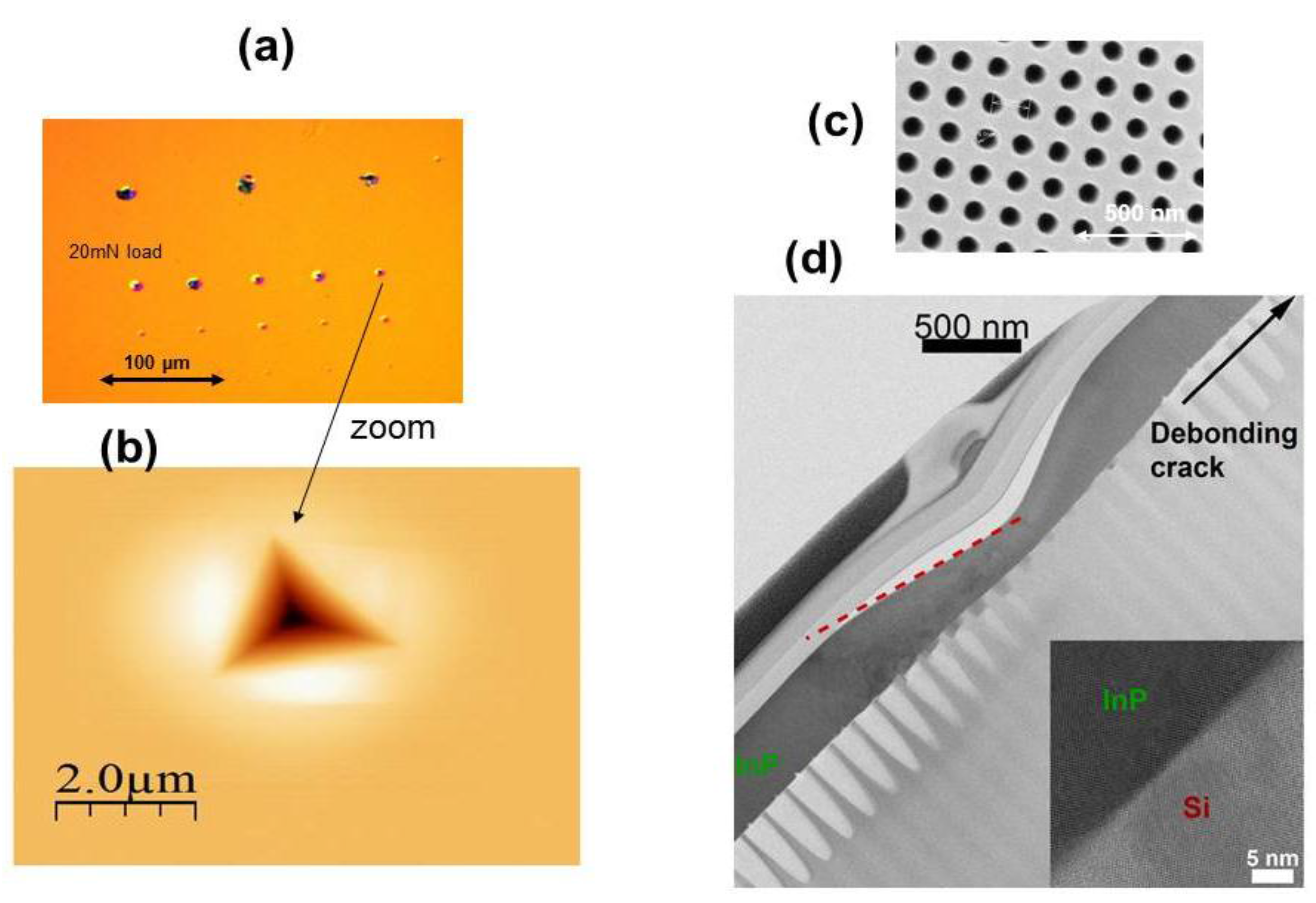 (a) Optical Microscope observation of the surface after indenting operation, (b) atomic force microscopy (AFM) image of a blister, (c) two dimensional Photonic Crystal (2D-PC) array of holes, (d) Cross-sections of an indent observed by TEM. Inset shows the InP/Si interface far from the indent.
