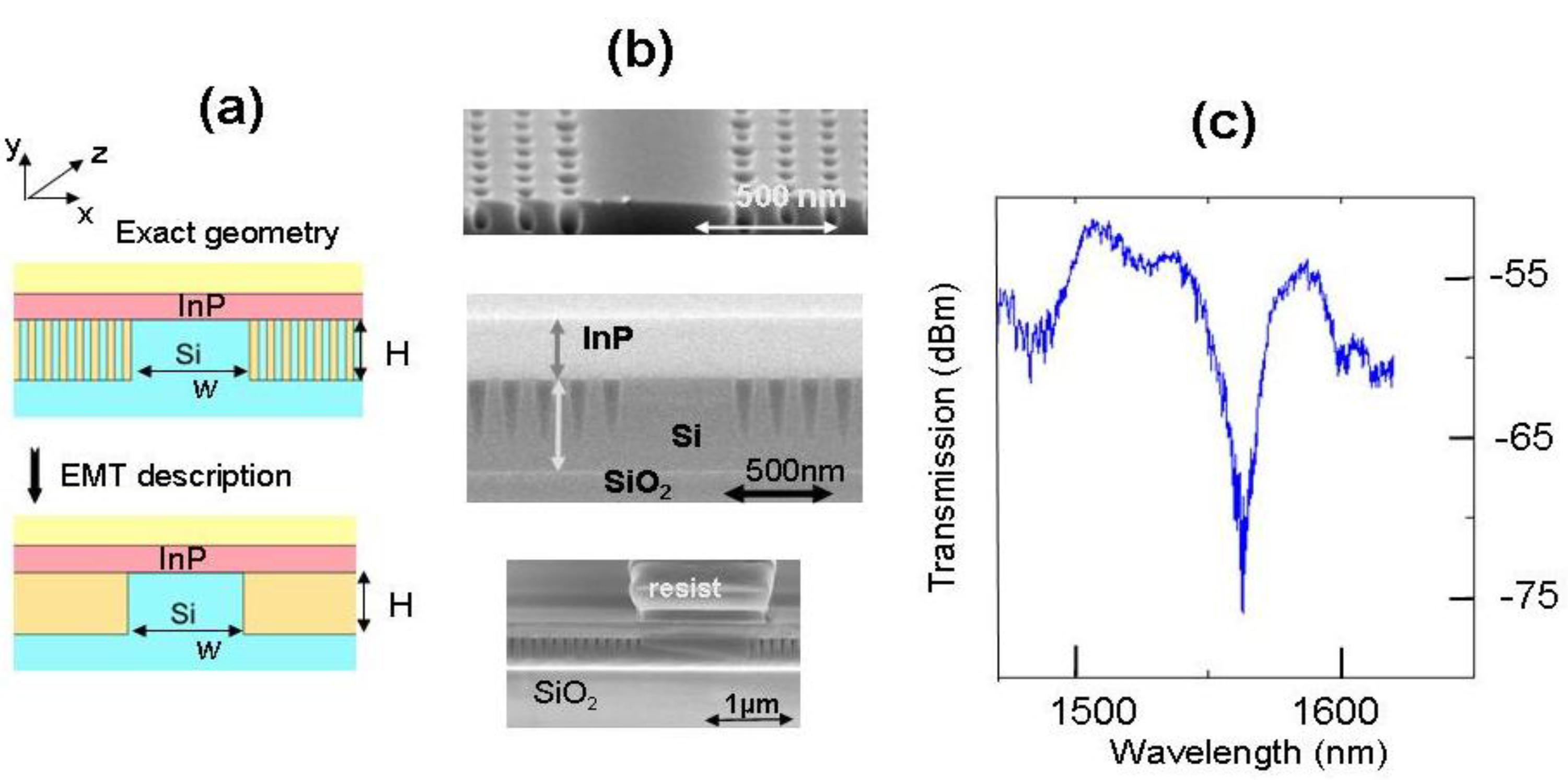 (a) Effective Medium Theory (EMT) representation of the 2D-PC used on the lateral cladding of the silicon waveguide, (b) SEM pictures: Top the silicon waveguide including the bi-periodic geometry Middle: the cleaved facet of the hybrid InP/Si waveguide Bottom: the resist line aligned on top to materialize the waveguide centre, (c) Spectrally resolved transmission of the hybrid waveguide.