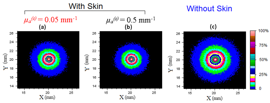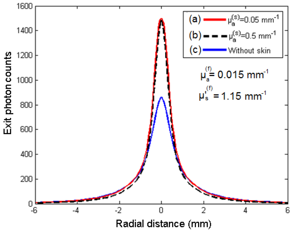 Moreover, the peak intensity is practically not affected by the absorption coefficient of the skin. According to [20], the skin acts like a screen which confines the diffused photons in the sub-surface (skin–flesh). In this case, more backscattering photons can escape the boundary (skin–air), and then contribute to increase the peak intensity of the spatial diffuse reflectance.