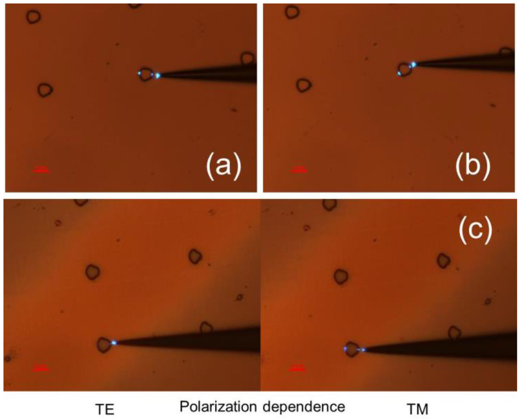 Experimental images in Figure 2 demonstrate measured performance of the designed magnifying fisheye lenses. In these experiments a near-field scanning optical microscope (NSOM) fiber tip was brought in close proximity to the arrays of lithographically formed TO devices and used as an illumination source. As expected from the numerical simulations, an image of the NSOM tip was easy to observe at the opposite edge of the lens. Angular and polarization testing of individual lenses in the array agrees well with theoretical modelling presented in Figure 1c,d. As illustrated by Figure 1a, the same d(r) profile produces a different refractive index distribution for TM and TE polarized light.