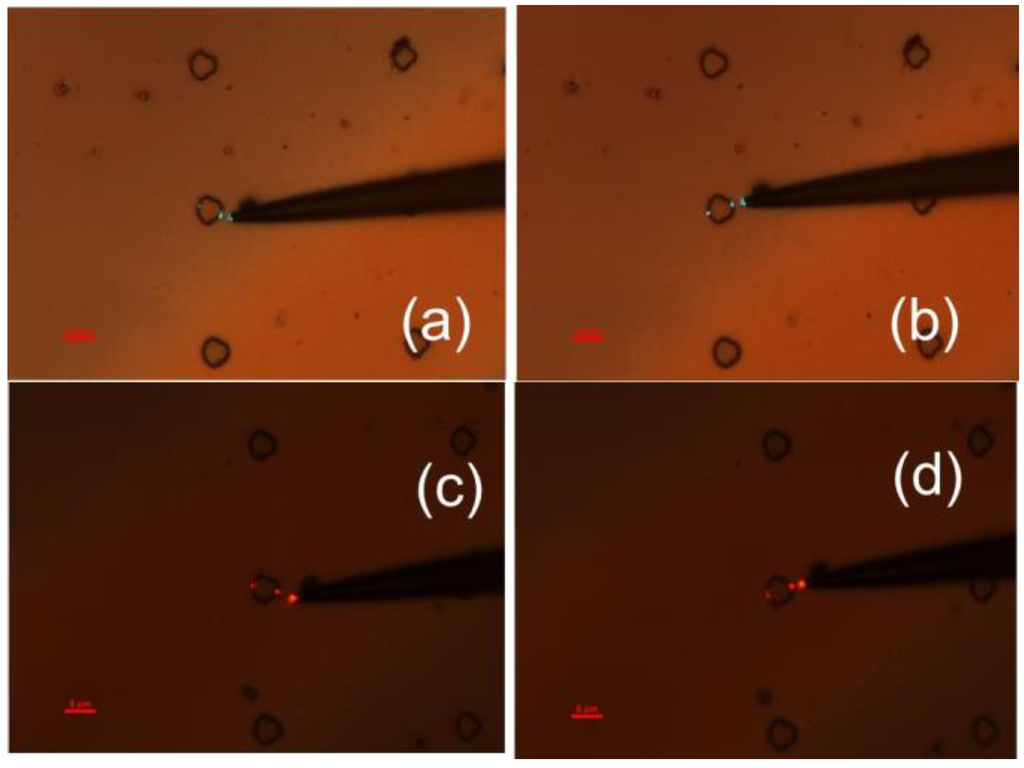 Experimental verification of broadband performance of the magnifying Maxwell fisheye lens. (a,b) Images taken at λ = 515 nm. (c,d) Images taken at λ = 633 nm. The scale bar length is 5 μm in all images.