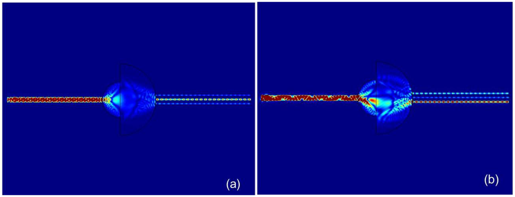 COMSOL Multiphysics simulations of a Maxwell fisheye-based mode sorter. (a) Symmetric excitation of the multimode input waveguide leads to the output power being channeled into the central single mode output waveguide. (b) Asymmetric excitation of the multimode waveguide leads to propagation of higher spatial modes, which are channeled preferentially into the side single mode waveguides. The spatial dimensions of the magnifying Maxwell fisheye lens in these simulations are the same as in Figure 1.