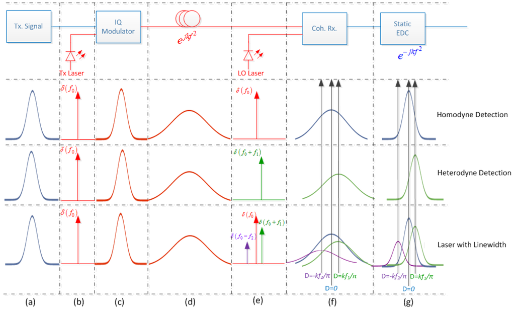 Physical explanation of EEPN in the most common coherent optical system configuration with electronic dispersion compensation. (a) Time domain electrical pulse to be modulated on the Tx laser, (b) Ideal transmitting laser (c) Optical pulse at the output of optical IQ modulator (d) Optical pulse after transmitting through dispersive fiber (e) Local Oscillator laser for three different scenarios (f) Received time domain signal after coherent detection (g) Received signal after static dispersion equalizer. Note: D depicts the delay relative to the pulse with homodyne detection with ideal LO as could be seen from Equation (4); considering only pulse envelop for visual understanding.