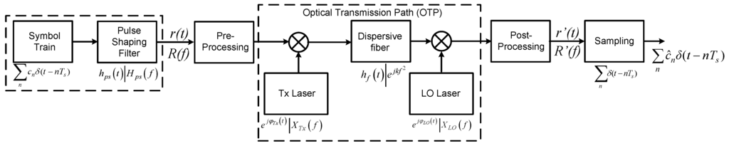 The Optical Transmission Path (OTP) consists of the following operations: modulation on Tx laser, transmission over the fiber link and coherent detection with LO laser. The detected signal is then processed to mitigate the residual impairments, which are not pre-mitigated on the transmitter side. The received signal after post-processing is given by the Fourier transform pair . The post-processing might also involve filtering with an optimally matched filter in the presence of additive white Gaussian noise (AWGN) to improve signal quality. However, as shown in [11,27], the linear filtering has a negligible impact on EEPN because its spectrum is almost identical to the signal spectrum. Hence, in these analyses, without compromising stringency, we neglect the matched filtering operation. The validity of this consideration for all system configurations shall be proved later. Furthermore, as the sampling is a memoryless operation, sampling and then performing CPR is equivalent to performing CPR followed by sampling operation. Thus, a generalized system configuration can be modeled as shown in Figure 2. In the following analysis, the mitigation transfer functions are modeled as the inverse of the impairment sources assuming ideal compensation. The Fourier transform pair of the mitigation operations for EDC and CPR are given by and where “Laser” represents transmitting laser Tx, local oscillator LO, or combined recovery for both Tx and LO given by Tx + LO.
