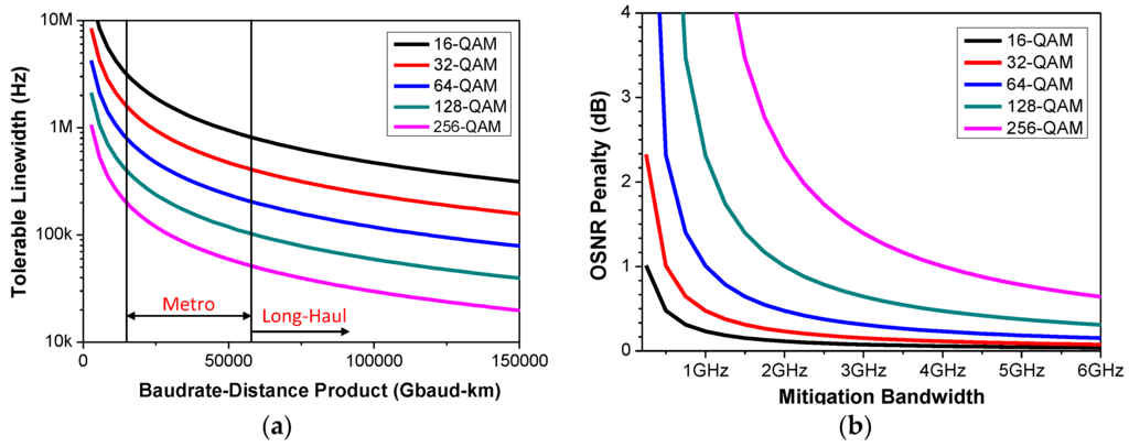 Ideal Analytical Curves for Tolerable Linewidth and Mitigation Bandwidth. (a) Tolerable Linewidth for 1 dB OSNR penalty versus Baudrate-Distance Product for different higher order constellations in different regimes such as metro and long-haul (b) OSNR penalty versus Mitigation Bandwidth for different higher order modulation and intrinsic laser linewidth of 4 MHz.