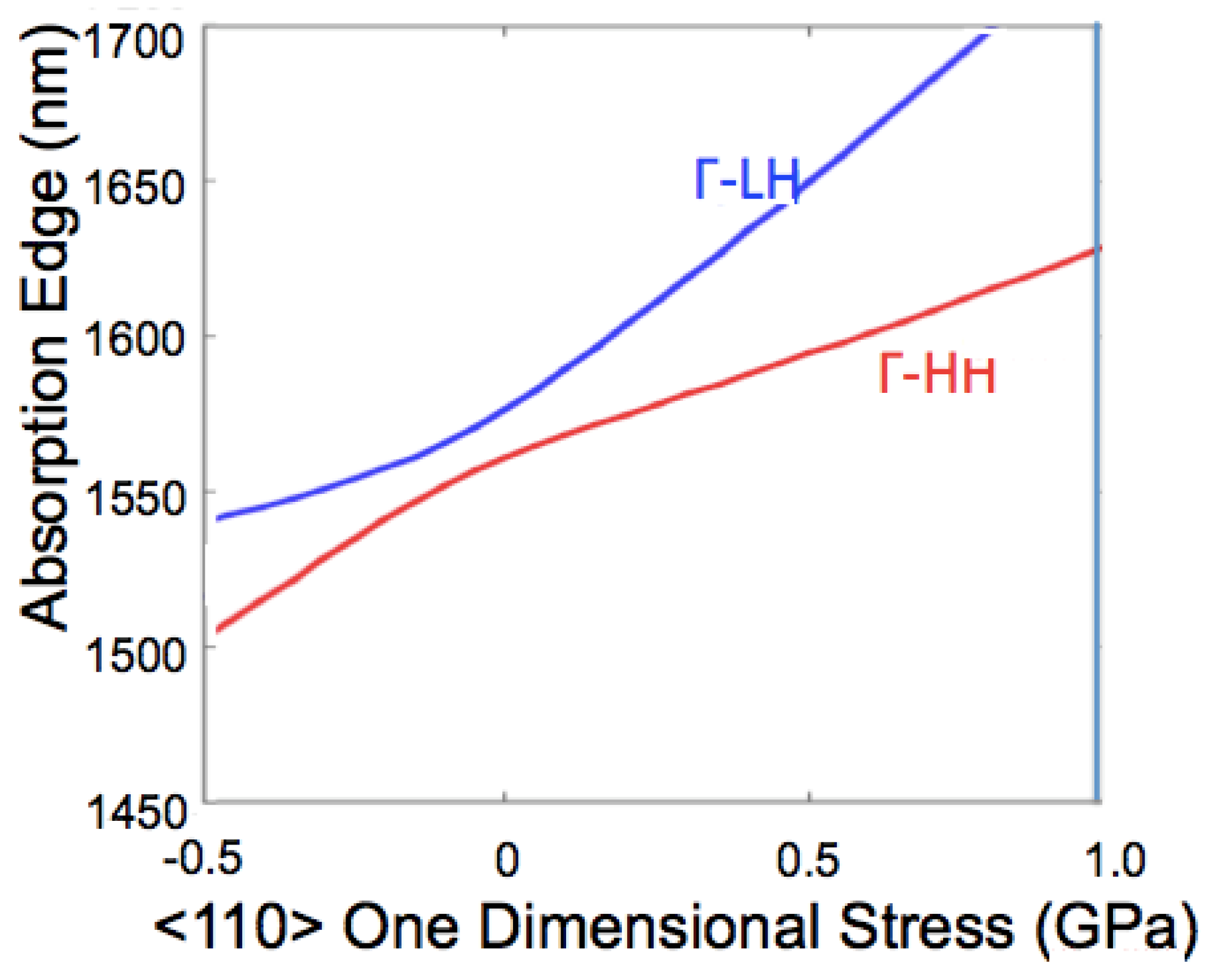 Fundamental absorption edge vs. <110> one-dimensional tensile stress of Ge. Ge has a built-in strain of 0.17% biaxial tensile due to growth cooling. This generates splitting of heavy hole (HH) and light hole (LH) even when no stress is applied. Applying one dimensional <110> tensile stress to the beam produces red-shifts in the absorption edge. The detailed calculations of the dispersion relation were reported elsewhere [11].