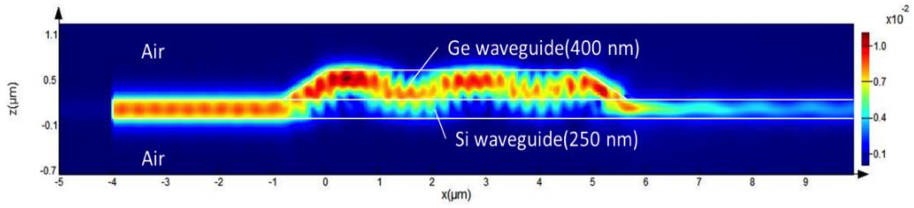 FDTD simulation of the propagation mode of 1550 nm in the wedge-shaped Ge waveguide on the Si rib waveguide.