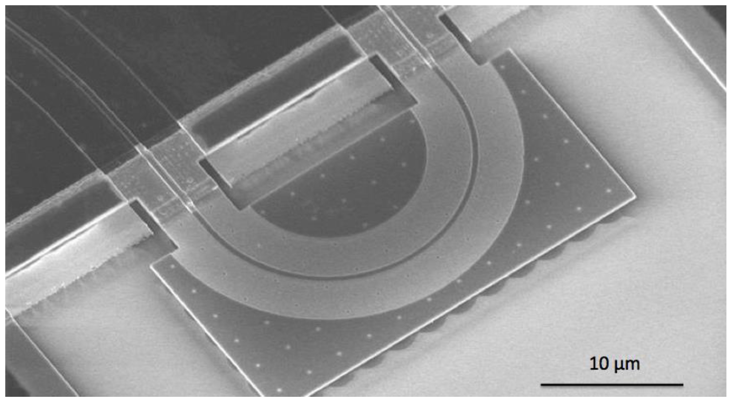 Figure 4 shows a typical SEM micrograph of the fabricated Si beam. The Si beam with two necks, the Si rib waveguide with a 10 µm bending radius on the beam, and two Ge waveguides on the Si rib waveguide on the necks are clearly shown, as designed. The white “dot” array on the beam is the through-holes to remove the BOX layer for fabrication of the free-standing beam and to maintain a thin SiO2 layer under the beam for optical isolation.