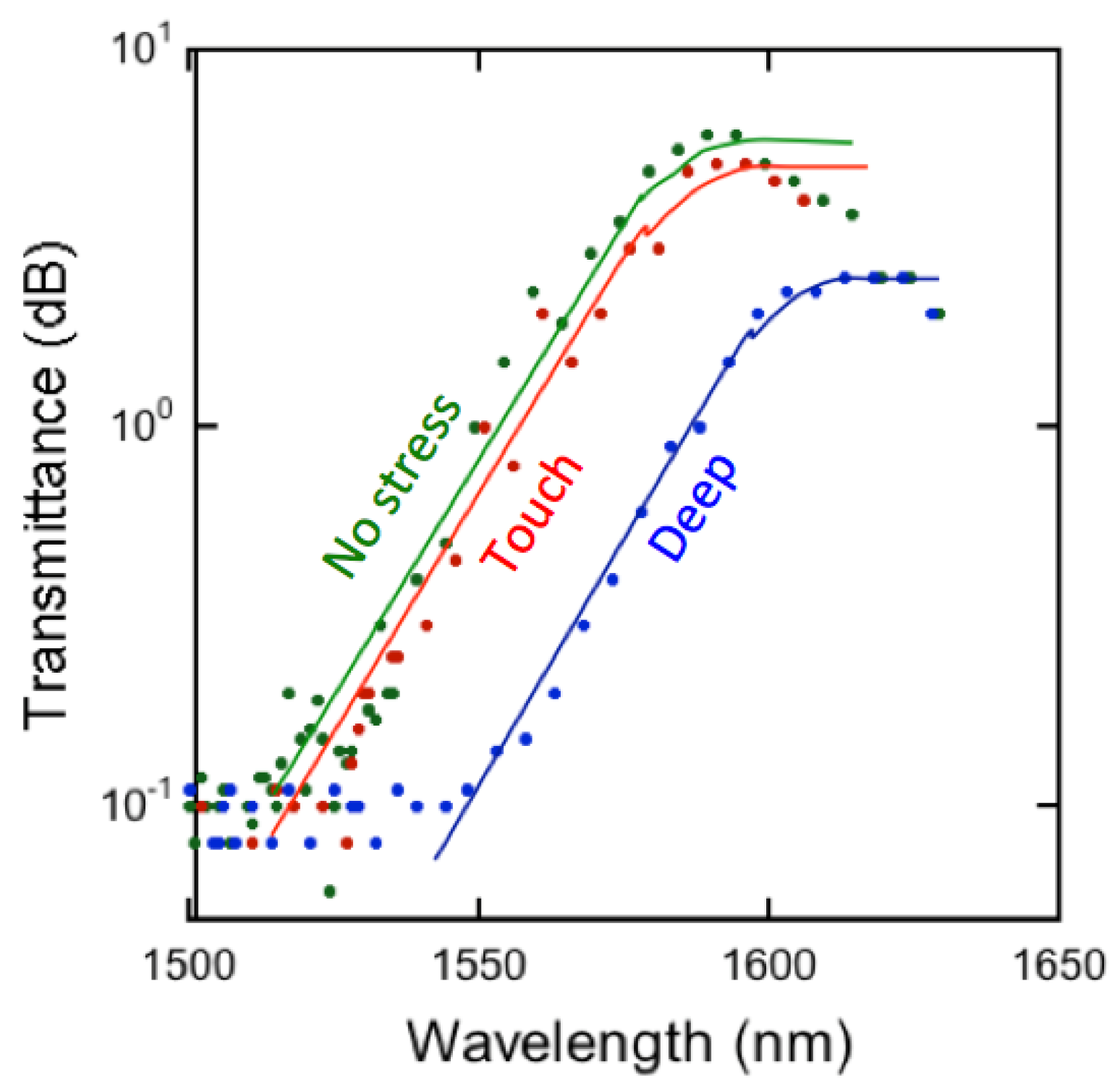 Figure 5 shows transmission spectra of the Ge waveguide under no stress (green) applied to it other than that applied to the “Touch” (red) and “Deep” (blue) points, as defined in Figure 1a. The curve fittings are performed based on the calculation of the absorption coefficient, due to the Ge indirect bandgap that is calculated using one phonon model [19]. The details are described in the Appendix. The fittings well reproduce the experiment results, where the temperature-dependent constant at 291 K is used at 1900 cm−1 for the best fits shown in the Appendix. It is experimentally shown from the results that the red-shift by stressing is ~7 nm at “Touch”, and ~52 nm at “Deep”, assuming 2 × 5-µm-long Ge waveguides on the necks. Here, the beam was bent by applying an external force to touch down to the base Si to get these red-shifts. The absorption curve at “No stress” was used as the reference.