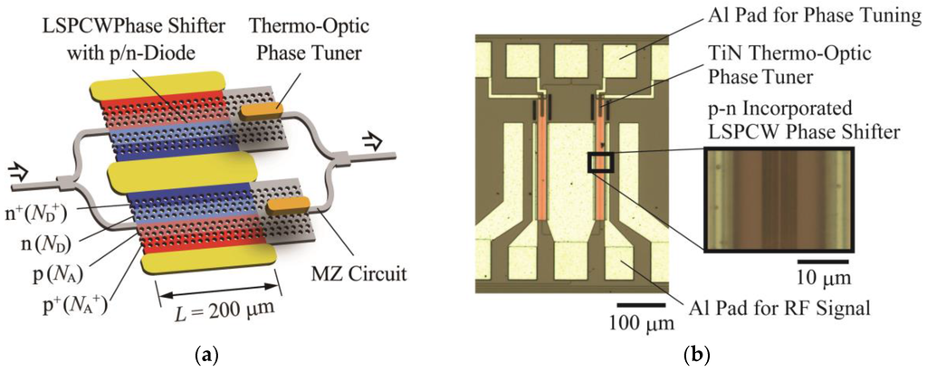 - Terada, Y.; Ito, H.; Nguyen, H.C.; Baba, T. Theoretical and experimental investigation of low-voltage and low-loss 25-Gbps Si photonic crystal slow light Mach-Zehnder modulators with interleaved p/n junction. Front. Phys. 2014, 2, 1–9. [Google Scholar] [CrossRef]