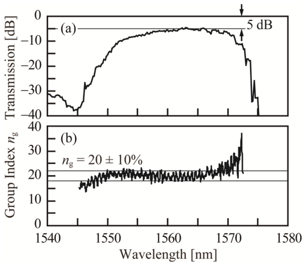 - Tamura, T.; Kondo, K.; Terada, Y.; Hinakura, Y.; Ishikura, N.; Baba, T. Silica-Clad Silicon Photonic Crystal Waveguides for Wideband Dispersion-Free Slow Light. J. Lightwave Technol. 2015, 33, 3034–3040. [Google Scholar] [CrossRef]