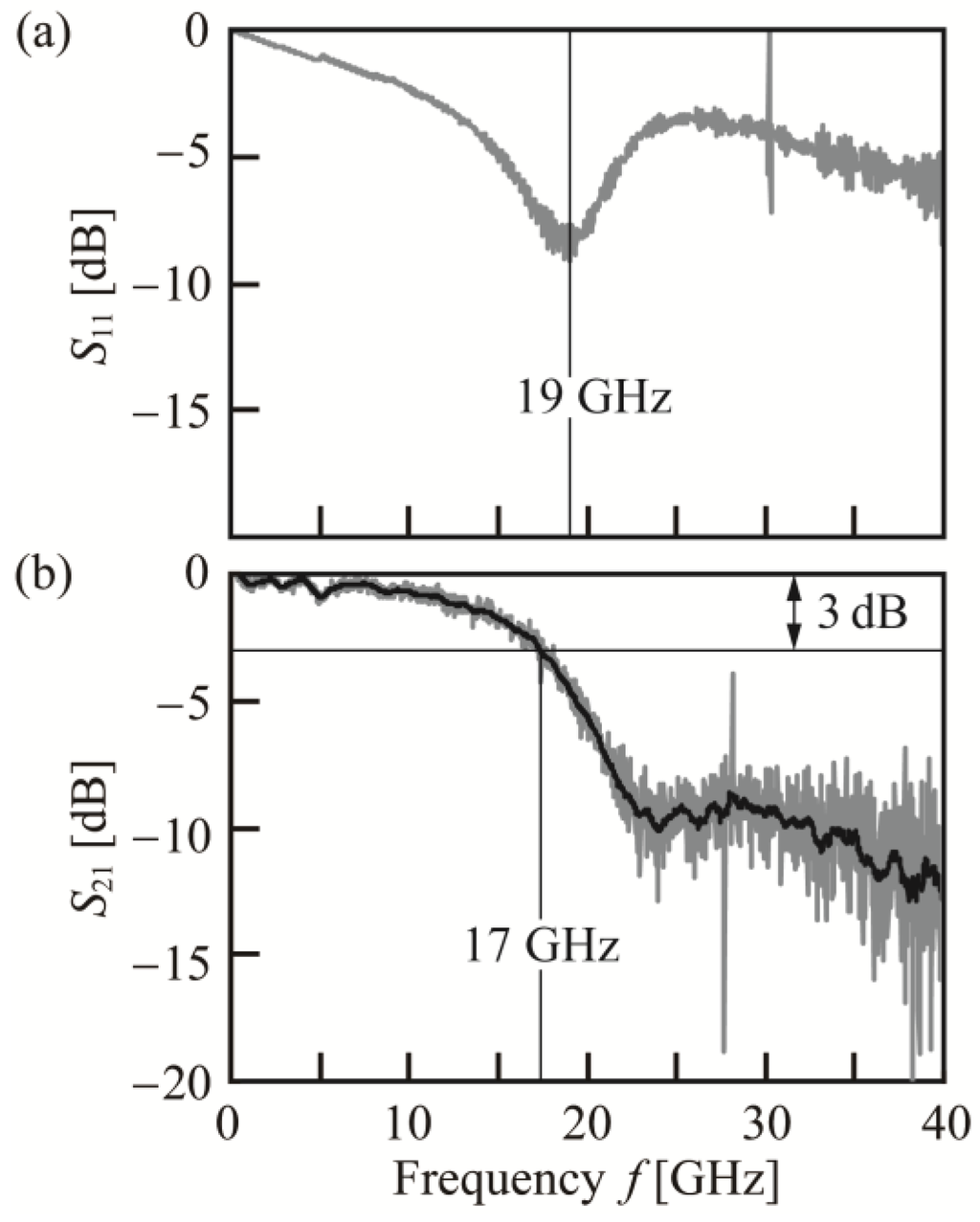 Measured S parameters: (a) S11; (b) EO S21 at λ = 1554 nm. Gray line shows raw data. Black line shows averaged values within each ~0.5 GHz range.
