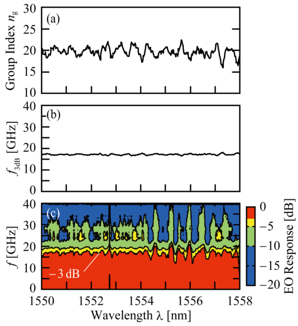 We measured the frequency response spectrum R(f, λ) by changing λ in steps of 0.02 nm in the LD band within the range λ = 1550–1558 nm. Figure 4 shows the measured results as a color plot, as well as the measured ng spectrum and calculated f3dB spectrum from Equations (2) and (3). R(f, λ) exhibits fluctuations, which are considered to reflect the ng spectrum, although they do not agree completely. The ng spectrum shows a relatively large and slow oscillation with an averaged period of 0.7 nm, and a small and fast oscillation with an averaged period smaller than 0.2 nm. This large and slow oscillation roughly corresponds to the fluctuations in R(f, λ) at f > 20 GHz, and therefore may correspond to the effect of the phase mismatch at higher f. On the other hand, f3dB depicted by the boundary between red and yellow regions only exhibits the small and fast fluctuation, lying between 15 and 20 GHz, with the exception of three wavelengths that show f3dB = 12–13 GHz. Thus, the frequency response of this device satisfies the requirement for the 25 Gbps operation over the wide wavelength range.