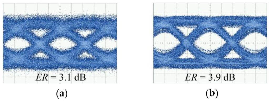 The 25 Gbps signal modulation was investigated over the wide wavelength range, using the non-return-to-zero (NRZ) pseudo-random-bit sequence (PRBS). Although the voltages from PPG (Anritsu MP1800A, Atsugi, Japan) were set as Vb ≈ −1 V and Vpp = 2.0 V, actual applied voltages should be modified by the open-ended electrodes, as mentioned above. The operation was first measured at λ = 1561 nm. Since the device and measurement setup had losses as outlined above, the output light from the device was amplified using EDFA and BPF, and then received and analyzed by an optical sampling oscilloscope (Keysight 86100C, 86109A, Santa Rosa, CA, USA). Figure 5a shows the eye pattern when the initial phase of the MZ arms was adjusted so that ER ≈ 3 dB was obtained. The open eye was observed with ML = 0.5 dB, which is comparable to that in a previous study [15]. Figure 5b shows a clearer open eye with ER = 3.9 dB when the ML was slightly increased to 1 dB.