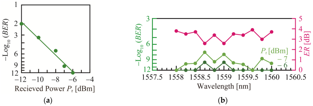 BER characteristics at 25 Gbps for 27 − 1 bit NRZ-PRBS signals: (a) BER at λ = 1559.6 nm; (b) BER and ER at λ = 1558–1560 nm.