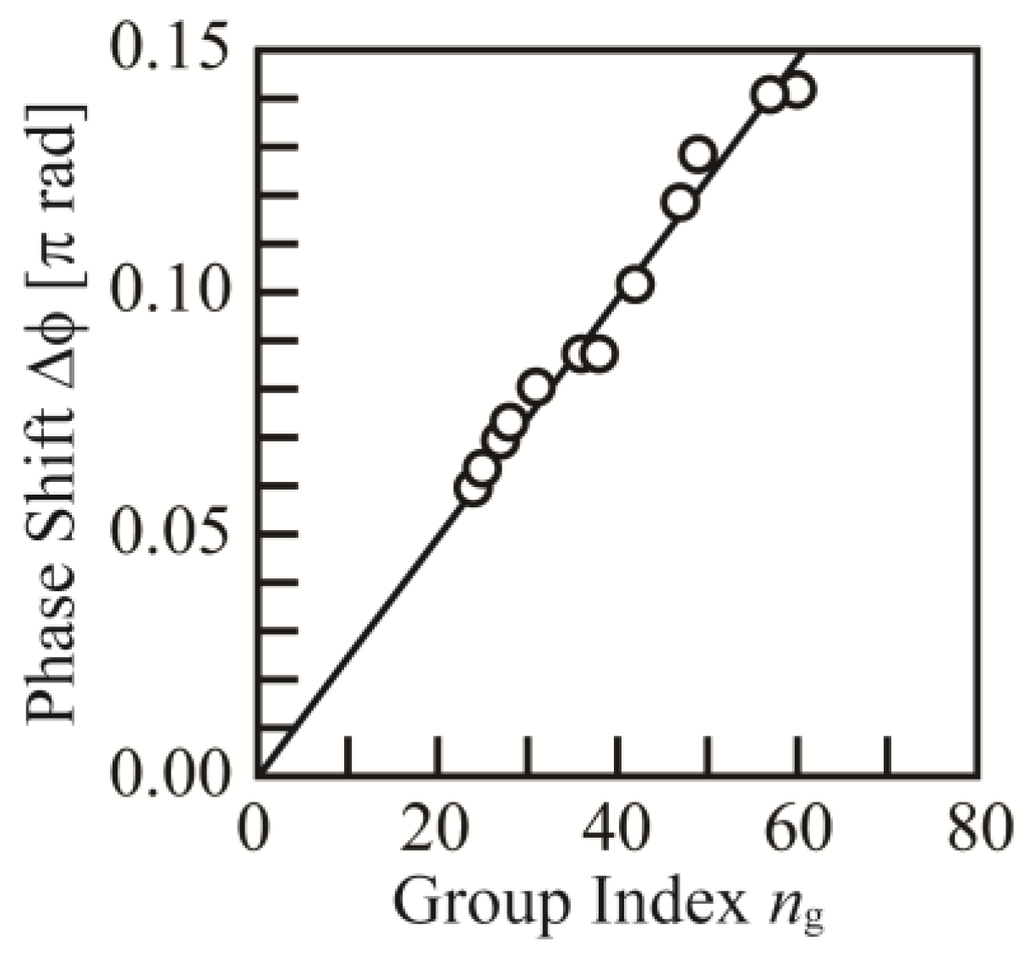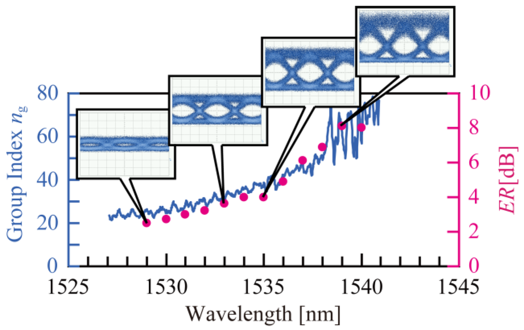 Figure 9 shows the result of the signal modulations. Although the voltages are the same as for Figure 5, the initial phase was set such that the transmission with no Vpp was reduced to 9 dB lower than the maximum, resulting in a large ML, and, hence, compensating for the low modulation efficiency. The ER was 2.5 dB at ng = 25, but increased to 8.1 dB at ng = 64. Figure 10 shows Δφ estimated from the ER as a function of ng. As expected from Equation (1), Δφ is almost proportional to ng, and therefore confirms the slow-light enhancement in the modulation efficiency. Equation (1) also indicates that Δφ depends on Δneq, which is determined by the overlap between the guided mode and the depletion region of the p-n junction. If the distribution of the slow-light mode changes with ng, Δneq would also change. Inversely speaking, the proportional behaviors between Δφ and ng suggest that the distribution is almost unchanged or is less severe for the modulator performance in this range. Equations (2) and (3) and the results in Figure 8 also suggest that such large ng makes the phase mismatch more severe and decreases Δφ. However, it is not apparent in Figure 10 because the slow-light enhancement in Equation (1) might be more dominant for the 25 Gbps PRBS signals whose major frequency components are lying at <12.5 GHz.