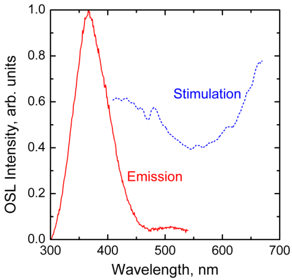 After X-ray irradiation, an OSL emission is observed in the UV range when stimulated by red light. The emission spectrum is illustrated in Figure 2. The irradiation dose was 20 Gy. The emission signal has a broad spectral feature peaking around 360 nm, while the sample is stimulated by 630 nm. Further, there seems to be a very small emission band with the peak around 505 nm, but the latter emission is found to be negligibly small compared to the UV emission. It is instructive to mention here that, interestingly, the OSL was also observed after a UV (254 nm) irradiation. A similar emission was previously observed at ~340 nm in radioluminescence [19] and in cathodoluminescence [20,21,22]; however, as far as we are aware, the origin of this emission has not yet been fully identified. Figure 2 also illustrates the stimulation spectrum measured while monitoring the 360 nm emission. The observed stimulation spectrum suggests that the OSL can be stimulated by light in a wide spectral range from approximately 550 nm to over 800 nm. The stimulated spectrum curve has some noticeable features. Particularly around 800 nm, the OSL stimulation is the most efficient among the spectral region tested. This indicates that the AlN has a large number of trapping center groups with different trapping depths. In the previous work, considerably shallow trapping centers were presented by TSL [19]; however, the OSL stimulation spectrum suggests a presence of deeper-but-stimulable charge trapping centers, especially those around 600 nm (~2.0 eV).