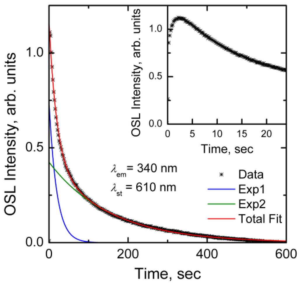 OSL decay curve. The OSL emission monitored is at 340 nm during a stimulation at 610 nm with a constant light intensity. The OSL curve can be approximated mainly by a sum of two exponential decay functions. The inset shows the OSL curve in a shorter time range 0–25 s after the stimulation started.