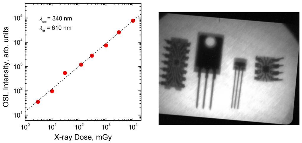 Experimental demonstrations of SHAPAL® AlN ceramic plate for use as an OSL dosimeter. (left) Dose response curve of OSL in an AlN ceramic plate. The stimulation light wavelength is 610 nm while the emission light is 340 nm; (right) X-ray image of some electronic components taken by OSL of AlN ceramic plate. The stimulation light used here is 630 nm ± 50 nm. The electronic components are (from left to right): logic gate, field effect transistor, bipolar transistor, and operational amplifier.