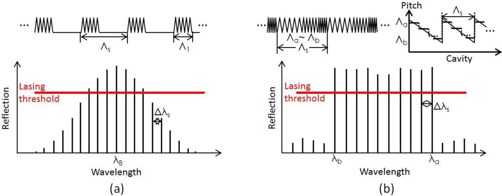 (a) Sampled grating structure and its reflectivity spectrum; (b) superstructure grating structure and its reflectivity spectrum.