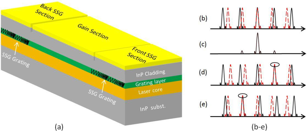 A schematic diagram of the SSG-DBR QCL is shown in Figure 2a. The device has three sections, which consist of a standard Fabry-Pérot gain section, a front SSG-DBR section and a rear SSG-DBR section. All three sections share the common active core and can be independently biased. The two SSG section operate as passive wavelength-selective reflectors and their refractive index can be controlled independently by adjusting the local temperatures. The local temperatures can be controlled by current injection to either SSG section or by mounting or integrating small heating/cooling devices to the sections [10,20,21].