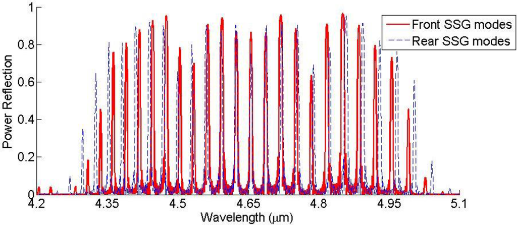 The SSG grating serves to enhance the cavity reflectivity and reduce threshold gain at designed wavelengths. Due to the on/off (yes/no) nature of the binary sampling gratings, under the same grating etching depth their equivalent κ is smaller than that of the SSG. Figure 3 shows the simulated SSG reflectivity profiles. Both the front and rear SSG modes are centered at 4.65 μm. There is only a small mode spacing difference between the two sets of reflection peaks. Between 4.35 μm to 4.95 μm there are more than 20 peaks over 50% reflectivity and more than 13 peaks over 80% reflectivity, provides good wavelength selectivity over a wide wavelength range.