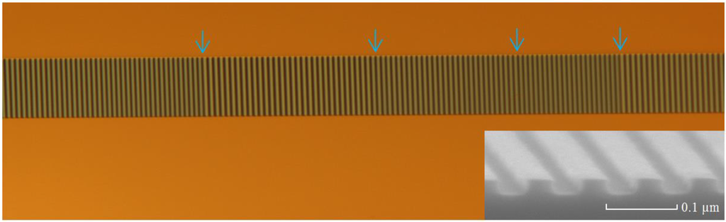 Both front and rear SSG gratings were patterned into the photoresist layer by e-beam lithography (Raith eLine system). The detailed structure of the gratings was described in Table 1. Figure 4 shows part of the front SSG section after the surface photoresist is developed. Five different piecewise variable gratings can be easily found in one SSG period.