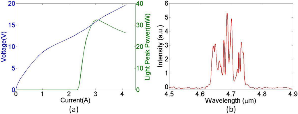 (a) LIV curve of 4 mm SSG-DBR QCL; (b) emission spectra for 2 mm Fabry-Pérot 4.7 μm QCLs at pumping current of 1 A.