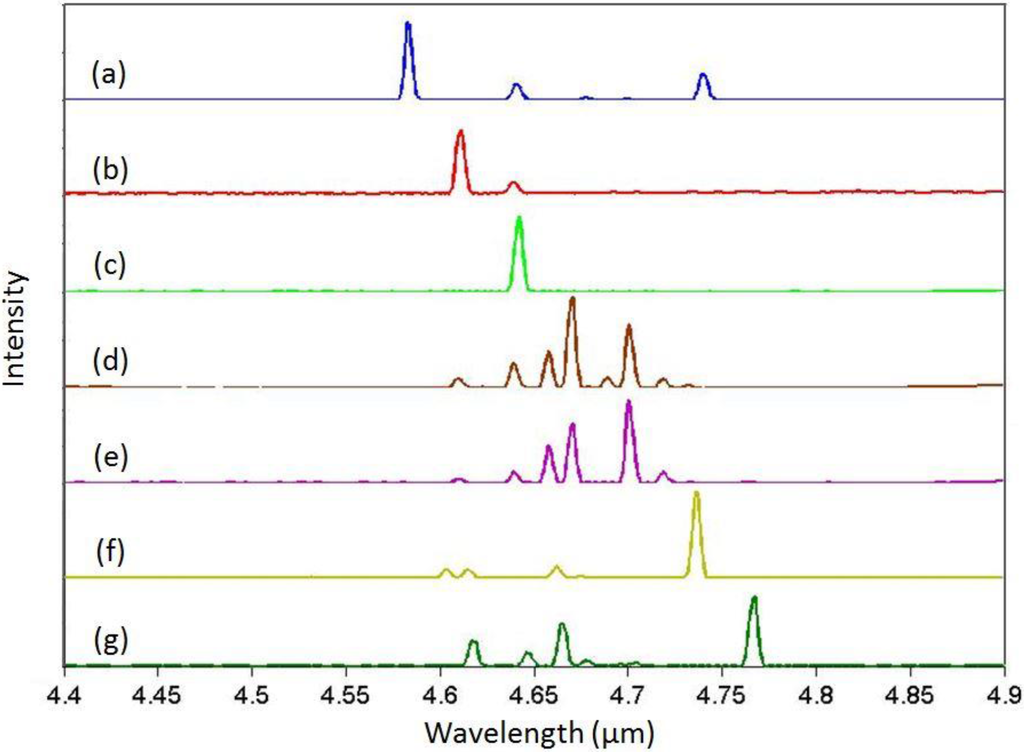 The emission wavelength of the SSG-DBR QCL is controlled by varying the injection currents to the two grating sections. The wavelength can be tuned as much as 60 cm−1 to the longer wavelength side and as much as 30 cm−1 to the shorter wavelength side, the total tuning range is 90 cm−1. Therefore, the wavelength can be tuned from 4.58 μm to 4.77 μm (90 cm−1) with a supermode spacing of 30 nm. This nonsymmetrical tuning is because the designed SSG refection spectrum center (4.65 μm) is not aligned with the laser gain profile center at 4.7 μm. At any given time, the laser can always achieve single mode operation. However, in some cases the spectra show insufficient side-mode suppression, which may be a combined result of multiple spectra from different tuning time and non-ideal FTIR scanning velocity setting taking place within a long FTIR plotting time of a few 10s seconds.