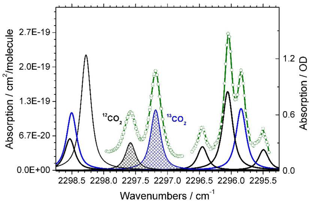 Selected spectral window and simulated positions of 12CO2 (black lines) and 13CO2 (blue lines) absorption. Left scale: Absorption in cm2 per molecule as a function of wavenumber. Positions and absorption/extinction coefficients were taken from the HITRAN (High Resolution Transmission) database for a simulated linewidth of 0.19 cm−1 (FWHM) Right scale: Detected absorption in optical density OD (without units) according to Lambert Beer law (green circles and lines, right scale).