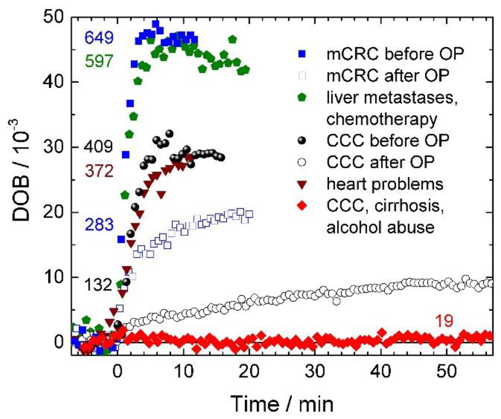 In Figure 5, DOB kinetics of patients with differing medical conditions are displayed. The individual data points of the DOB kinetics represent the 13CO2 increase in the complete breath with respect to the baseline taken before 13C-methacetin administration. The measured average increase of 13CO2 in the exhaled breath within a time window of ~40 s is displayed by a single data point. The DOB kinetics display distinct shapes with a rise after time zero, when 13C-methacetin is administered, a maximal value ranging from 1 DOB to about 50 DOB, followed by a signal decrease. The LiMAx value evaluates from the maximum of the DOB kinetics and is presented as a color coded number in µg/kg/h next to the DOB kinetics in Figure 5. Since the signal decrease after reaching the DOB maximum is not relevant for the LiMAx value, the measurements are stopped after determination of the maximum. This procedure enables short measurement times as short as about 10 min after 13C-methacetin administration (blue filled squares, and wine triangles in Figure 5). The presented rise times are in the range of 1 min–2 min for LiMAx values above 310 µg/kg/h. LiMAx values of 311 µg/kg/h and higher were assigned to normal liver capacities [4,23,29]. Fast rise times can only be observed with a high data density. We displayed data points every ~40 s to maintain high data density and make the interpretation of the kinetics easier. In Figure 5 two pairs of DOB kinetics are plotted for patients before and after liver surgery. The blue curves represent the DOB kinetics of a patient with metastatic colorectal cancer. Before operation the LiMAx value was determined to 649 µg/kg/h with a fast rise of the kinetic and a maximum of about 48 DOB as displayed in Figure 5 (blue filled squares). After liver resection the DOB kinetic exhibits a lower maximum of 20 DOB reached at ~20 min after 13C-methacetin administration. Nevertheless, the LiMAx value of 283 µg/kg/h was close to the normal liver capacity. The black curves represent the DOB kinetics of another patient with cholangiocellular carcinoma before (solid black circles) and after liver resection (open black circles). The LiMAx value dropped upon liver resection from 409 µg/kg/h to 132 µg/kg/h, directly visible by the maximum decrease from 28 DOB to 9 DOB, respectively. The rise of the DOB kinetics after liver resection (open black circles) are slowed down about five-fold, reflecting the smaller liver capacity of the reduced liver volume. The liver resections are often the exclusive curative treatment. The liver can recover completely after operation, if the remaining metabolic liver function remains above a certain threshold [21,30]. Three additional DOB kinetics are plotted in Figure 5. The green curve reflects the DOB kinetic of a patient with liver metastases after chemotherapy. Despite the toxic chemotherapy the liver capacity of this patient is in good condition again with a LiMAx value of 597 µg/kg/h. This measurement is an example for the usefulness of the LiMAx test in chemotherapy, providing information on the stressed liver.