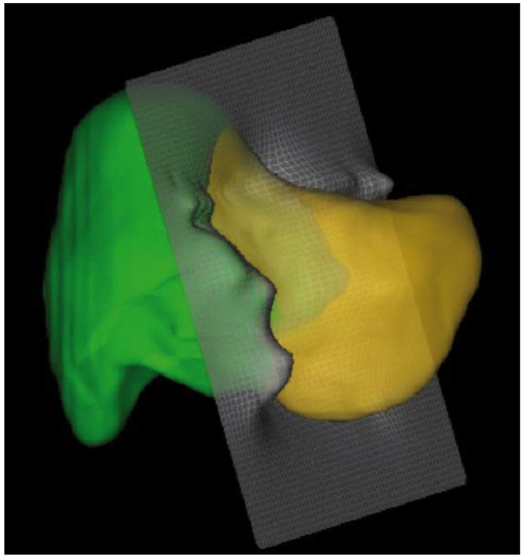 3D picture of the liver before surgery measured by CT volumetry. LiMAx value before surgery was 639 µg/kg/h. Liver segment 2 and 3 (yellow) are identified to remain after surgery with a calculated remnant volume of 31%.