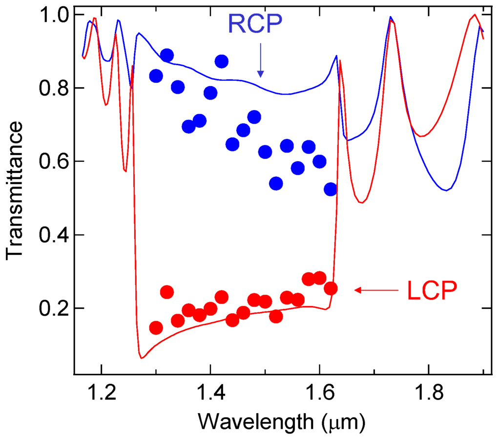 Transmittance spectra for RCP and LCP lights. Blue (red) curves and balls show the calculated and experimentally obtained spectra, respectively.