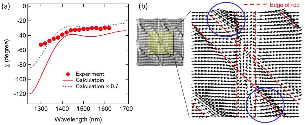 The maximum rotation angle obtained in the present experiment is 52.5° at 1.3 μm. Considering the total thickness of chiral structure, this value corresponds to a rotation power of ~2.6 × 105 °/cm, which is ~1000 times larger than in α-quartz. We also observed a large rotation angle > ~30° over the measured spectral range. The large optical rotation in the structure is explained by abrupt changes of the optical electric field at the interfaces of rods in neighboring plates. Figure 5b shows the distribution of the electric field vector calculated at the interface between the first and the second plates when linearly polarized light at a wavelength of 1400 nm is injected. The electric field changes its direction largely in small regions at around the cross points of two rods (inside the circles). The spatial dispersion of the electric field within wavelength-scale regions can be accumulated through a unit cell along the stacked direction due to its chiral nature. This induces large optical rotation effect in chiral 3D PhCs. Details on the experiment and analysis procedures, as well as other discussions, can be found in our previous report [64].
